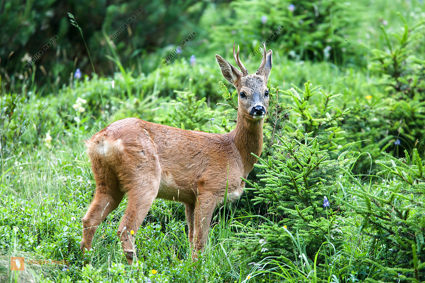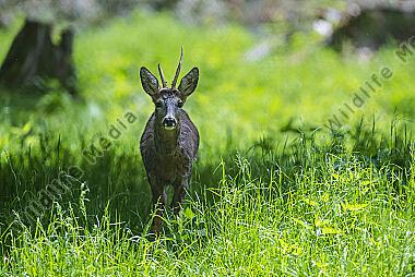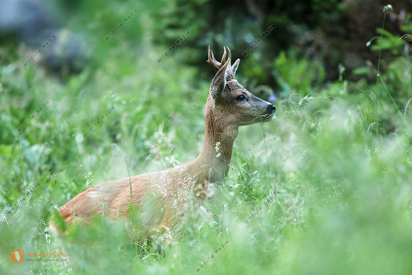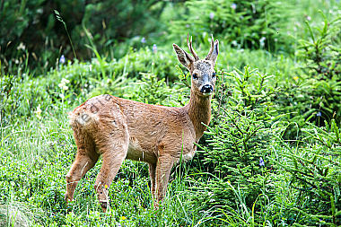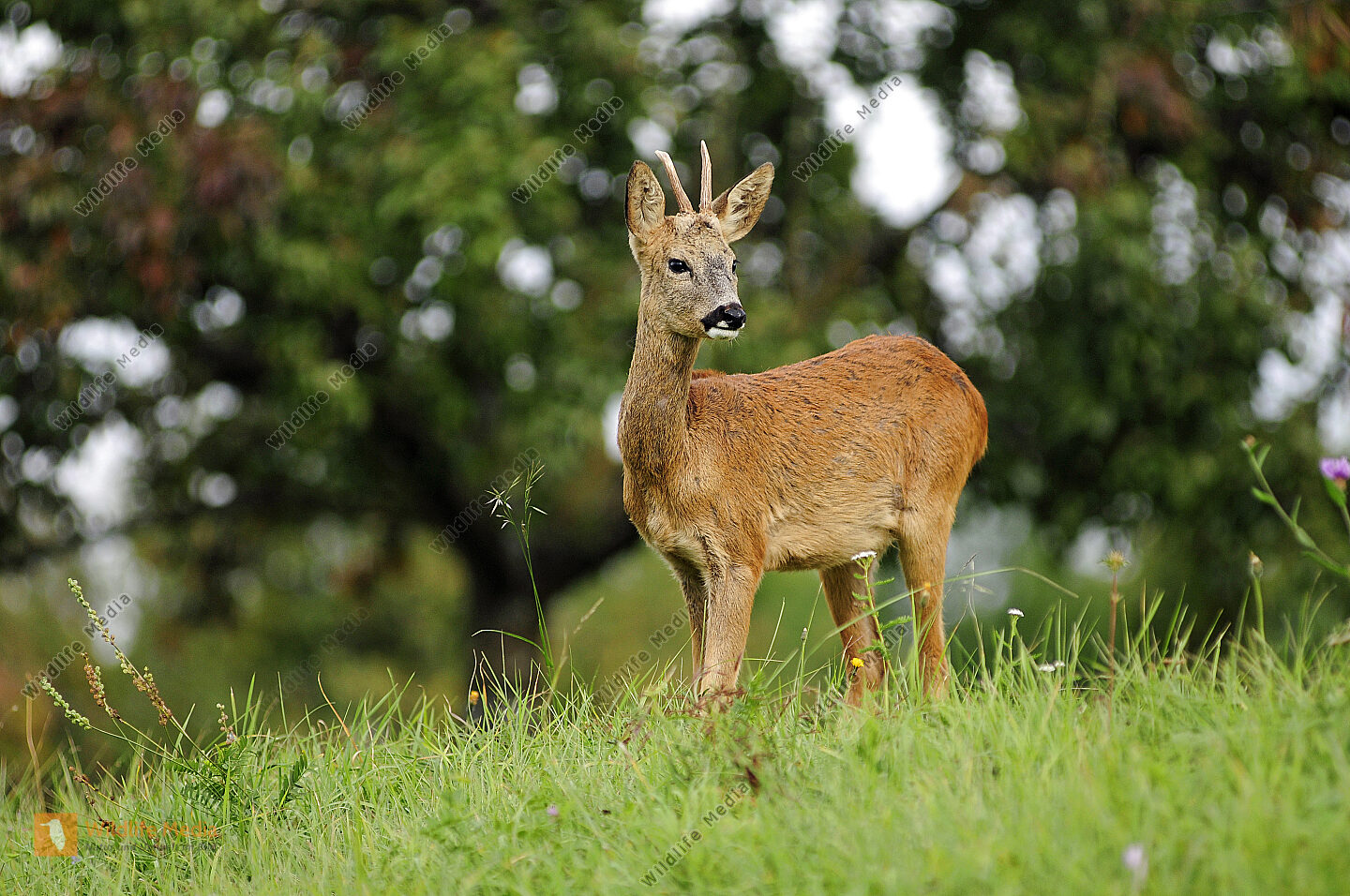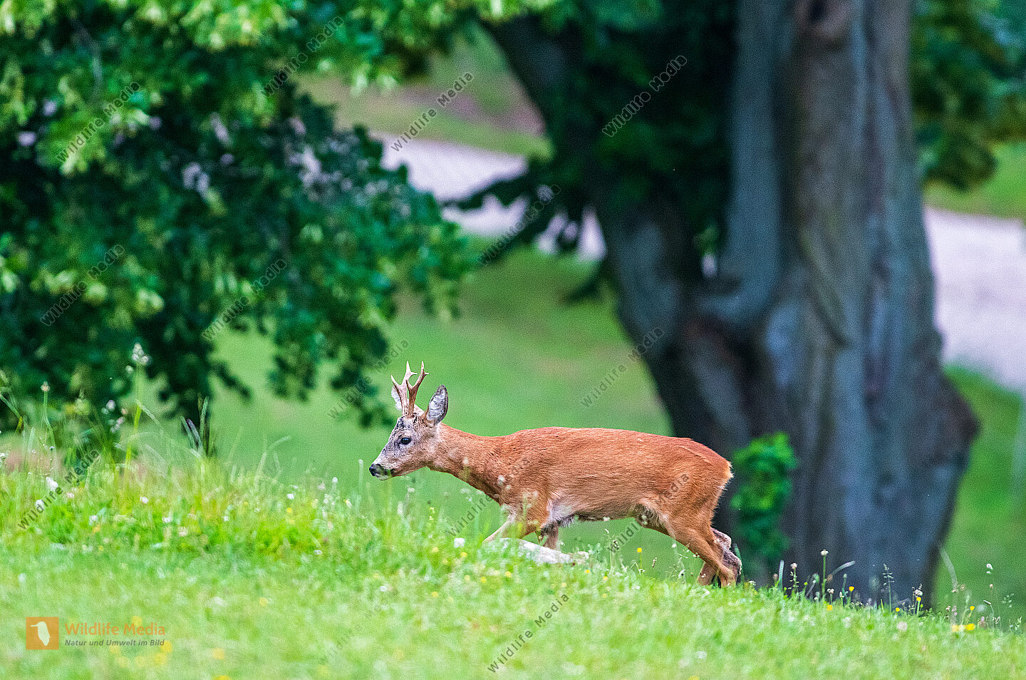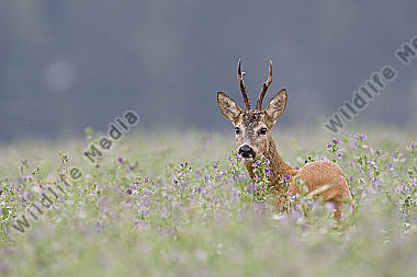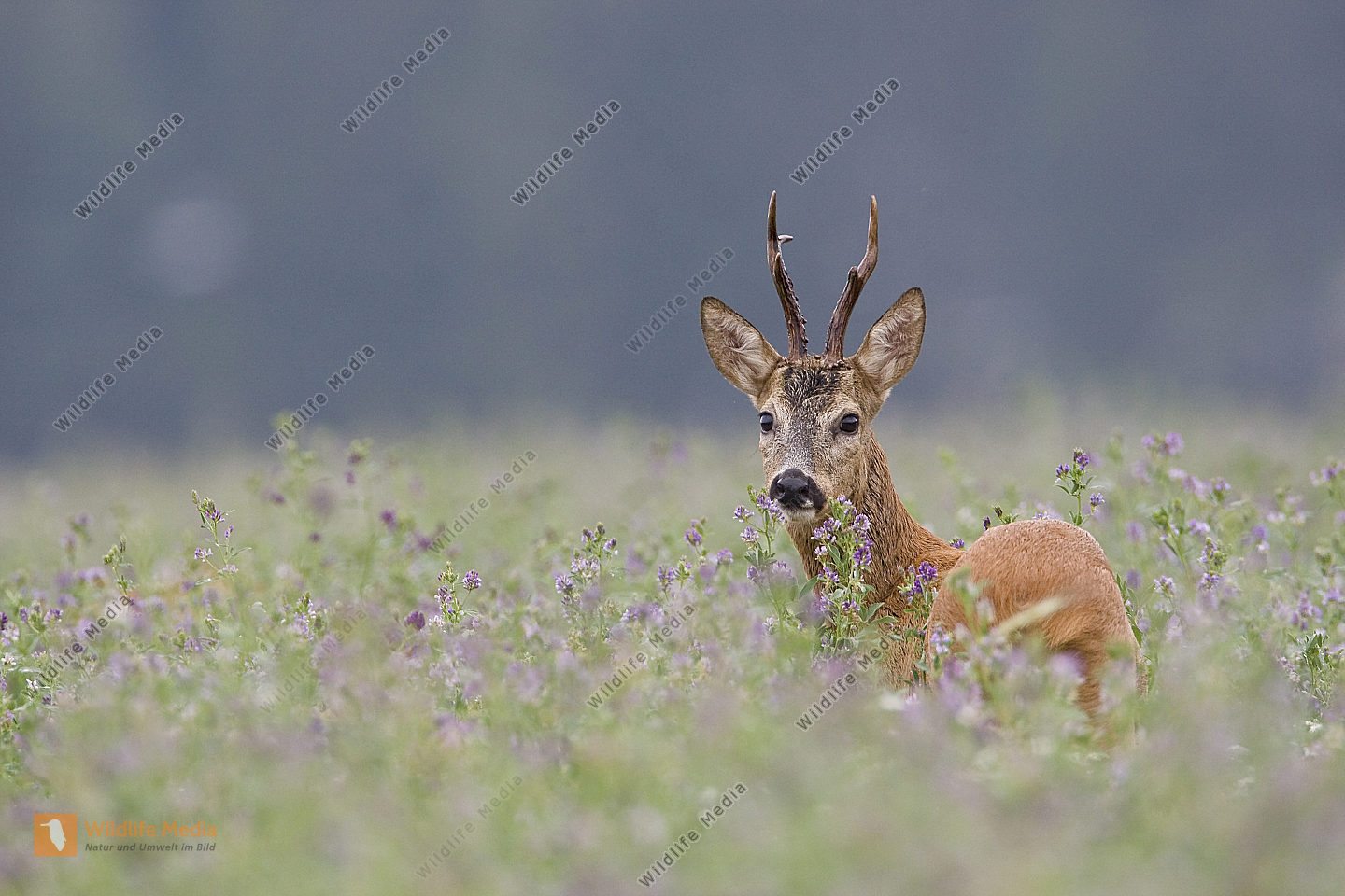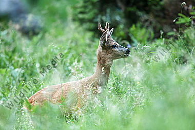 Rehbock Capreolus capreolus auf einer blühenden Wiese