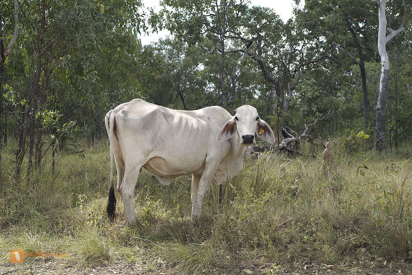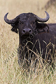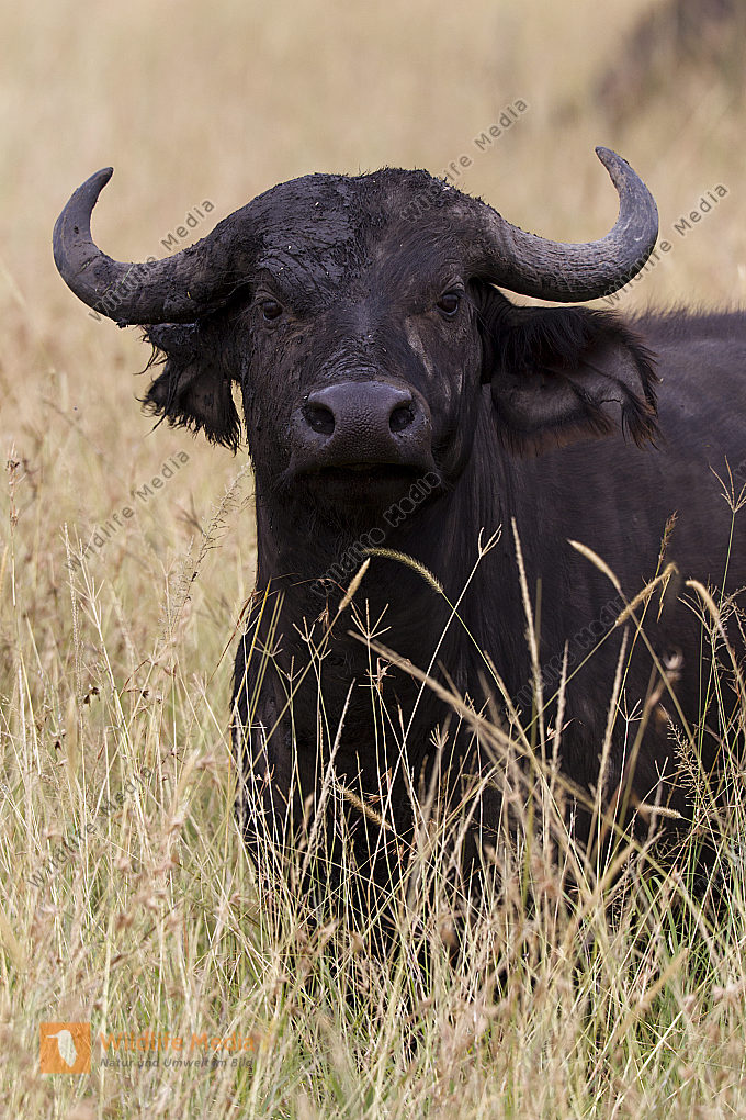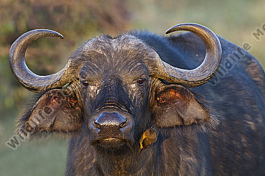 Kaffernbueffel Portrait mit Madenhacker Masai Mara Kenia