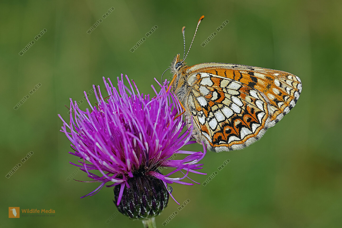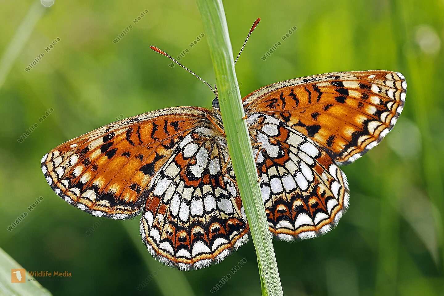 Ein Wachtelweizen-Scheckenfalter saugt an seiner Futterpflanze