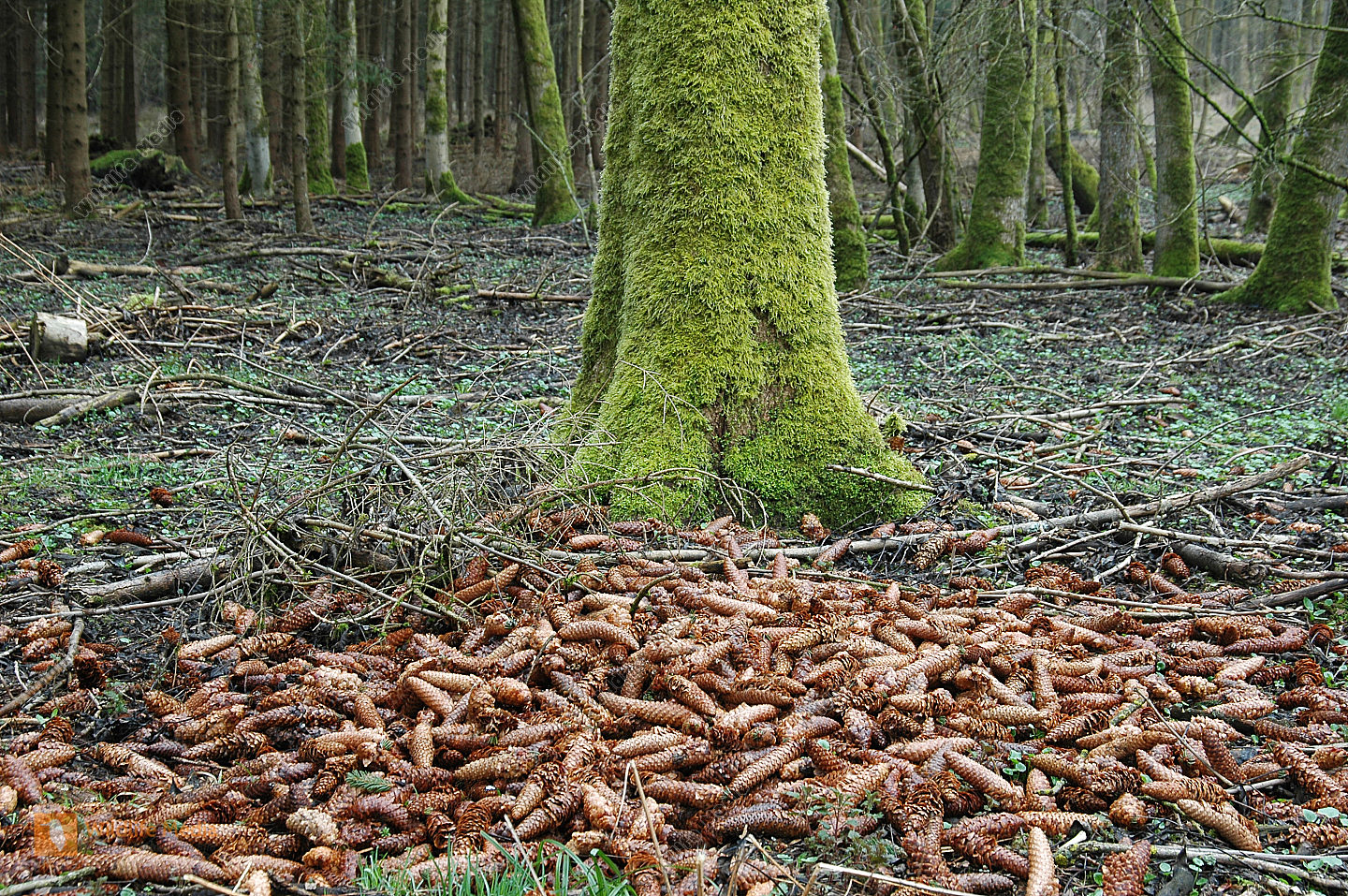 Schwarzspecht Dryocopus martius Weibchen Nahrung Fichte Borkenkäfer