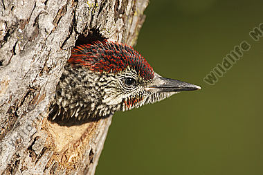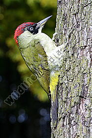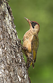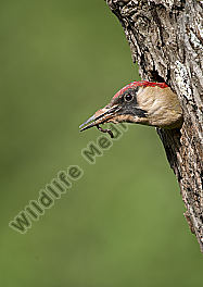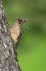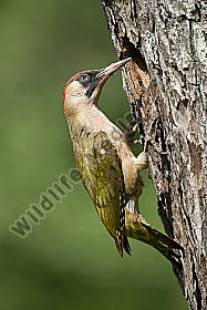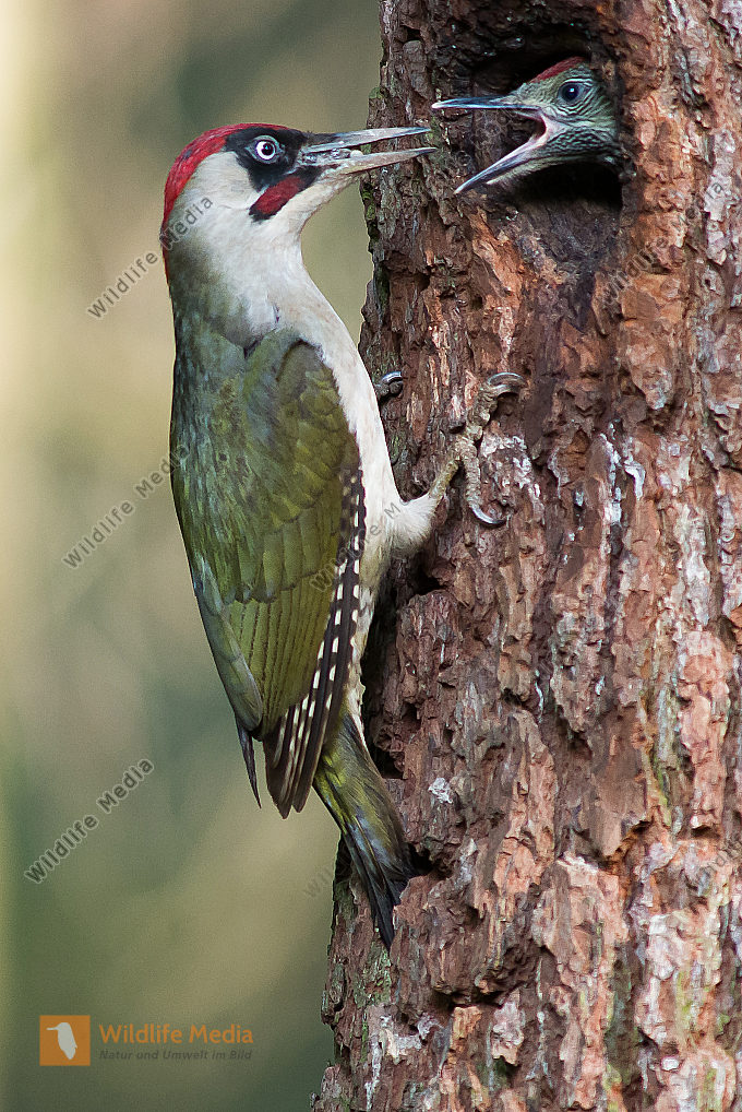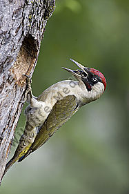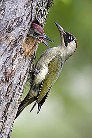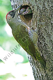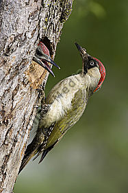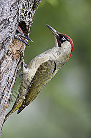 Gruenspecht Picus viridis Männchen Bruthöhle Fütterung Jungvogel