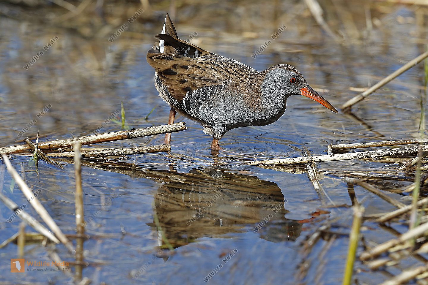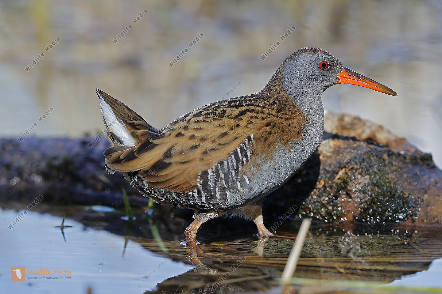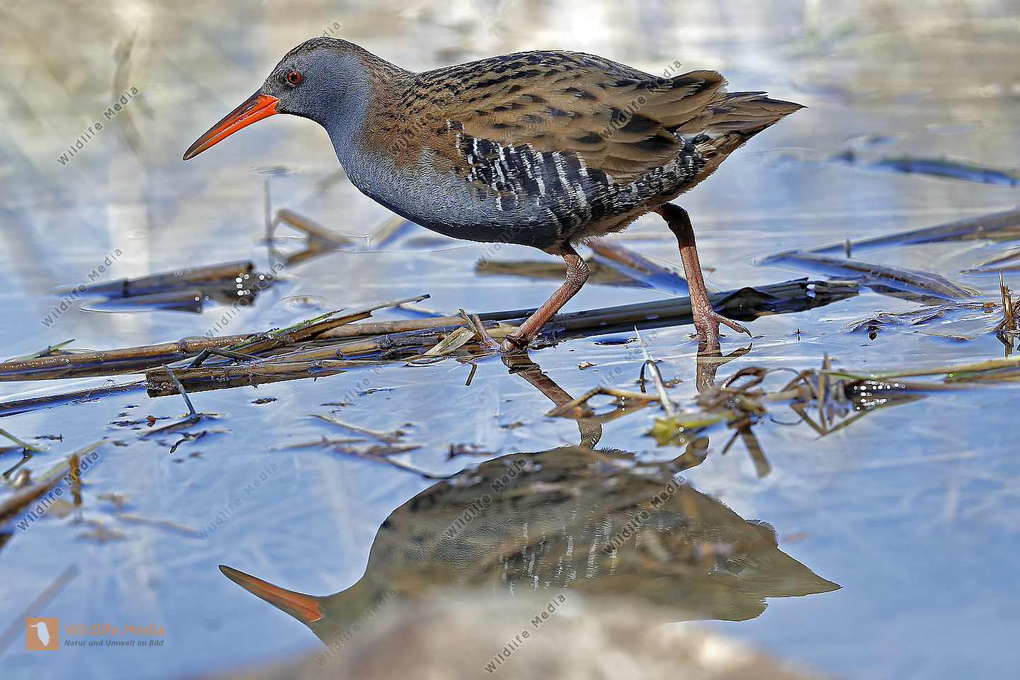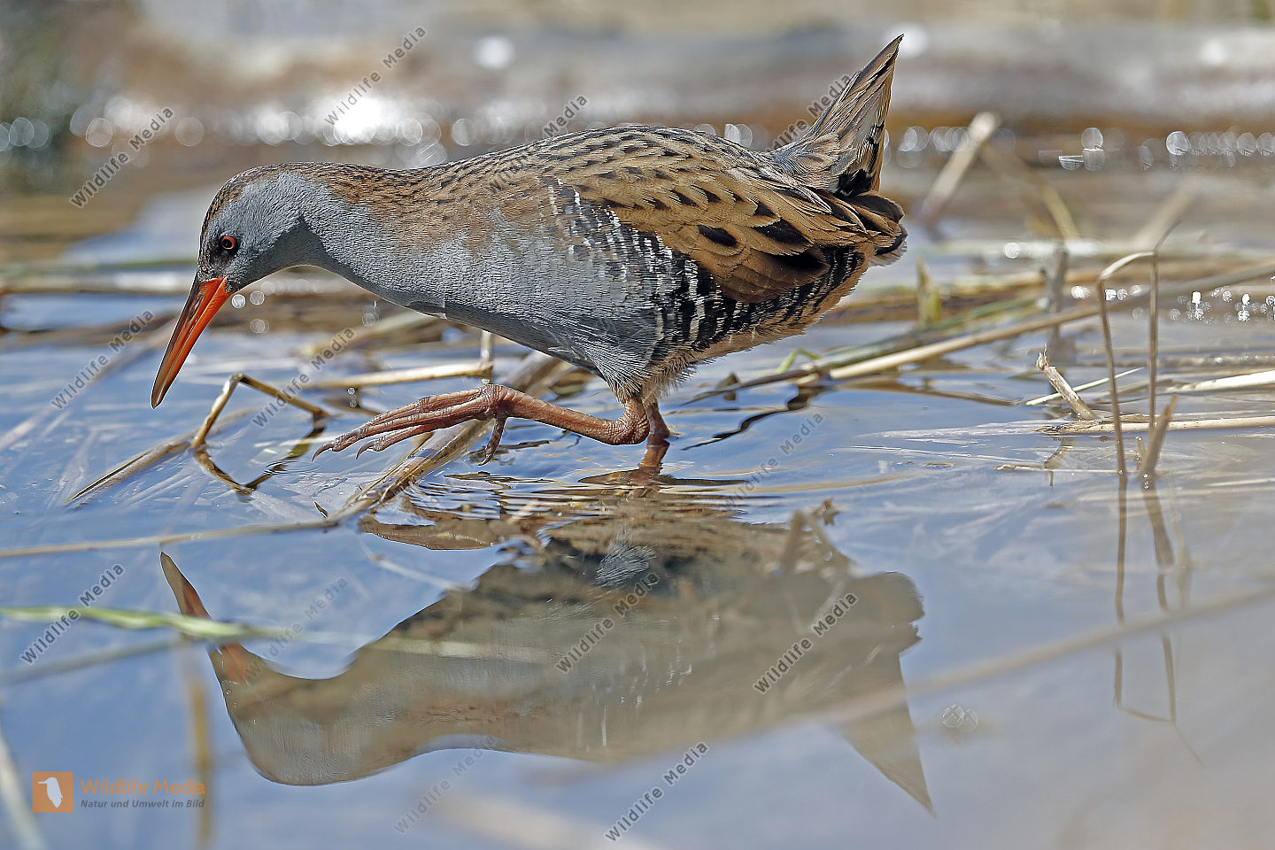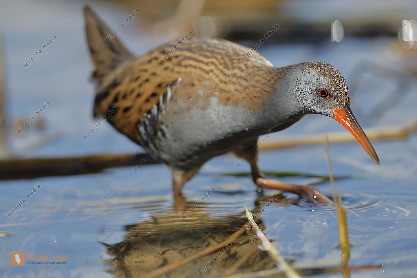 Eine scheue Wasserralle hat sich aus ihrem Versteck gewagt. Sie watet durch das Wasser des Erbach un
