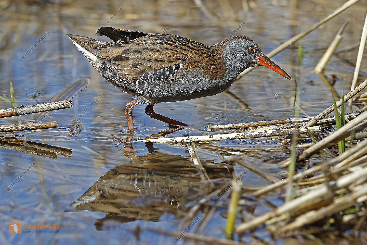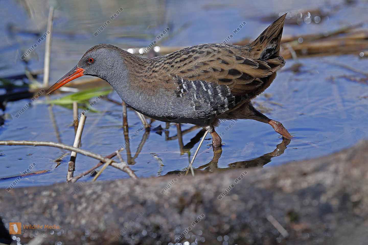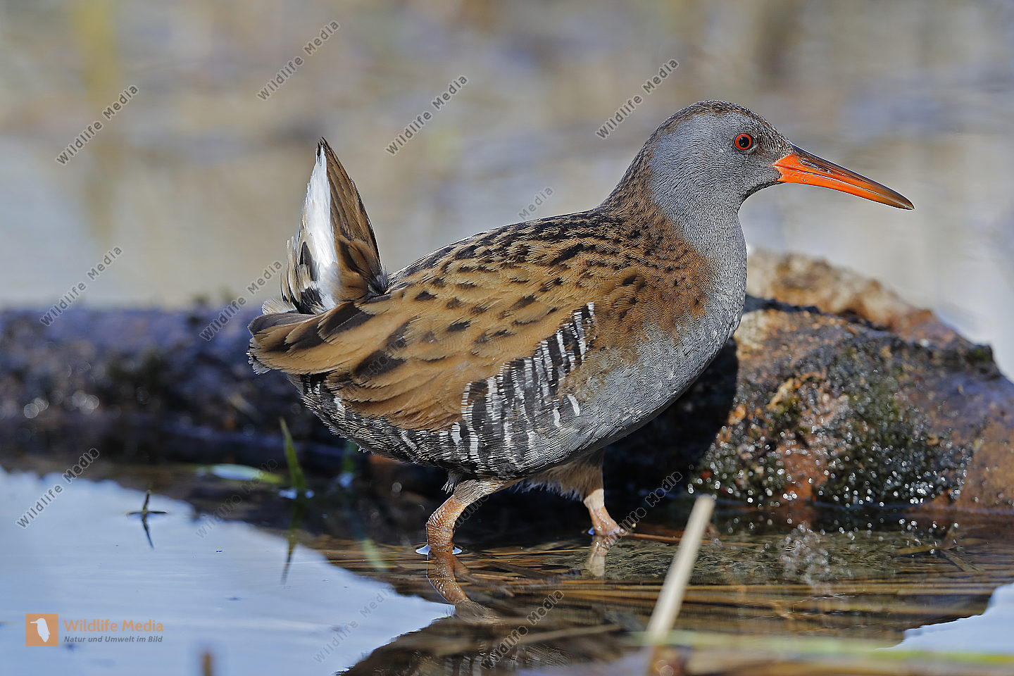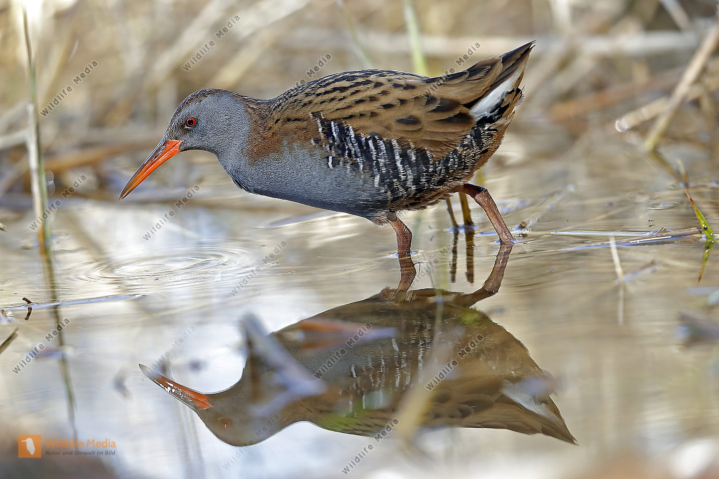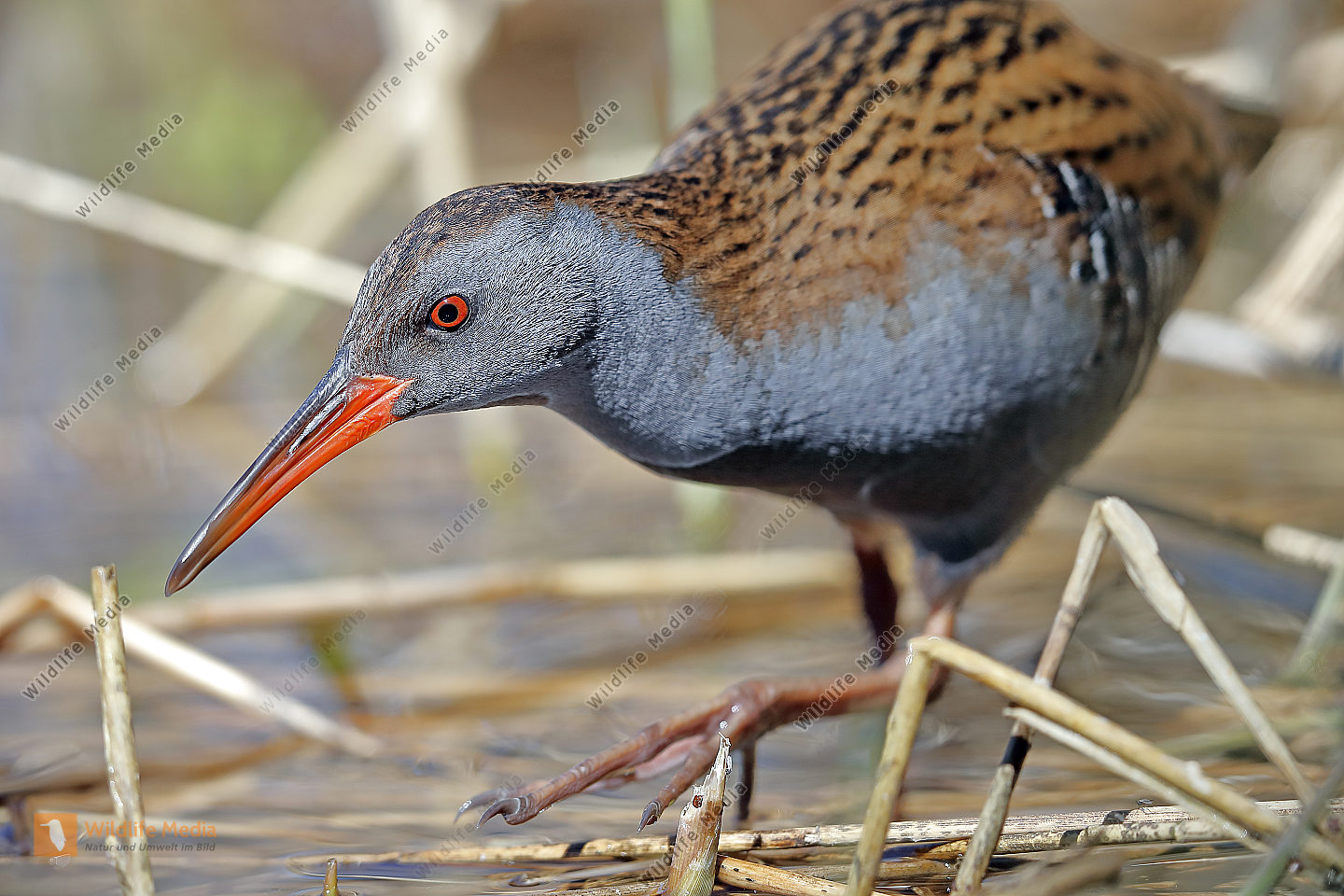Eine scheue Wasserralle hat sich aus ihrem Versteck gewagt. Sie watet durch das Wasser des Erbach un