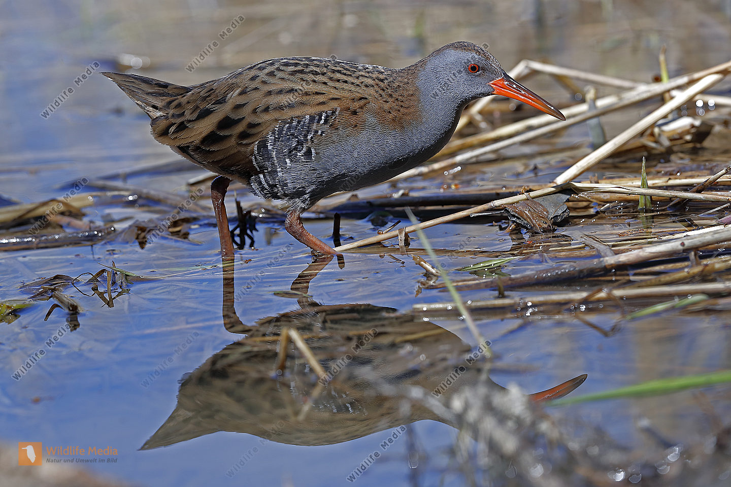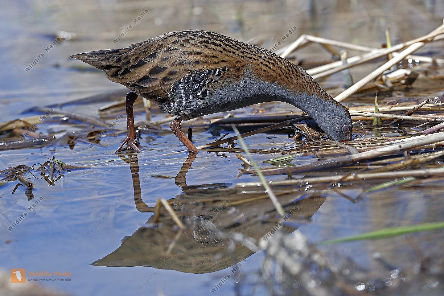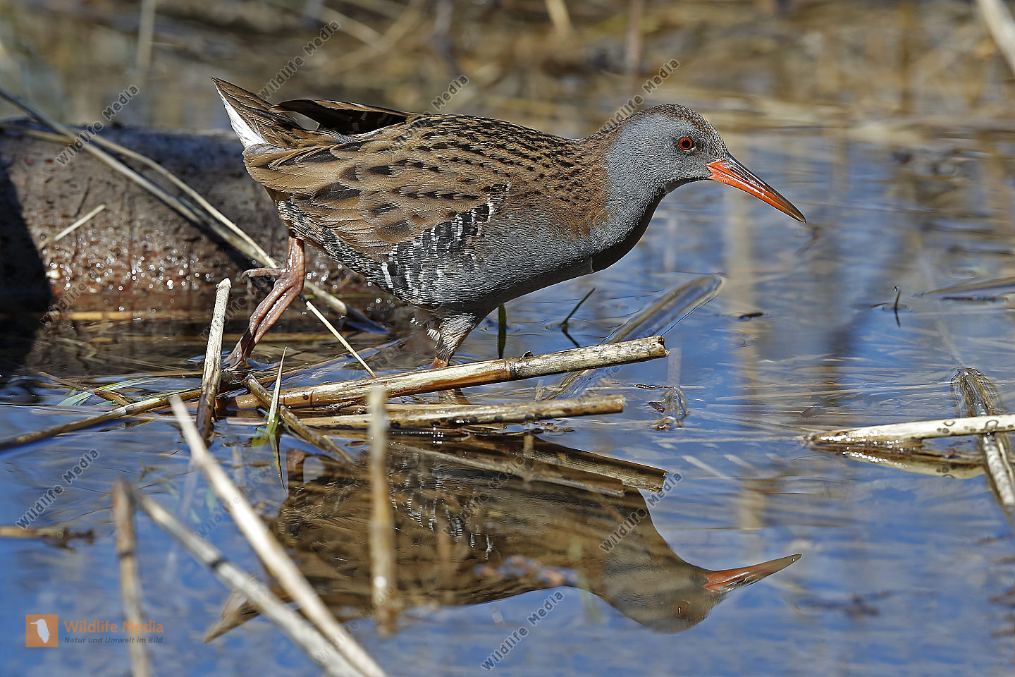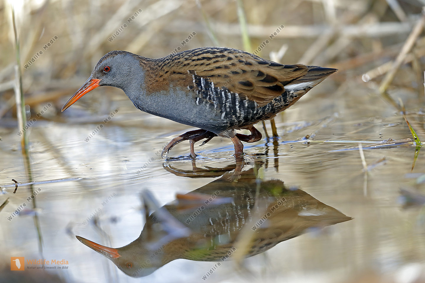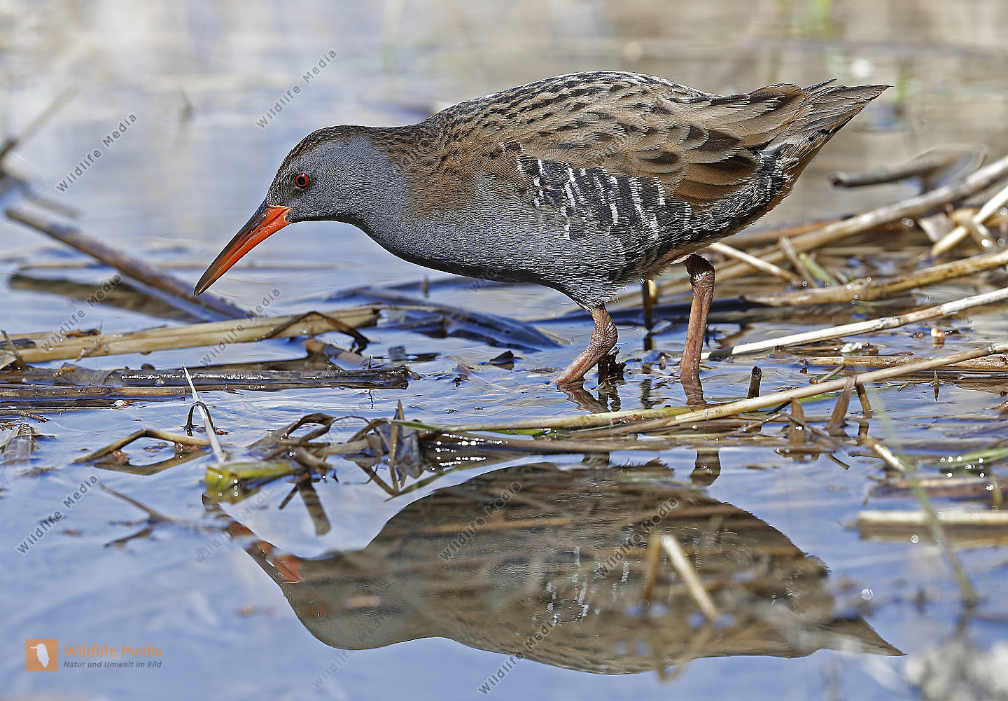 Eine scheue Wasserralle hat sich aus ihrem Versteck gewagt. Sie watet durch das Wasser des Erbach un
