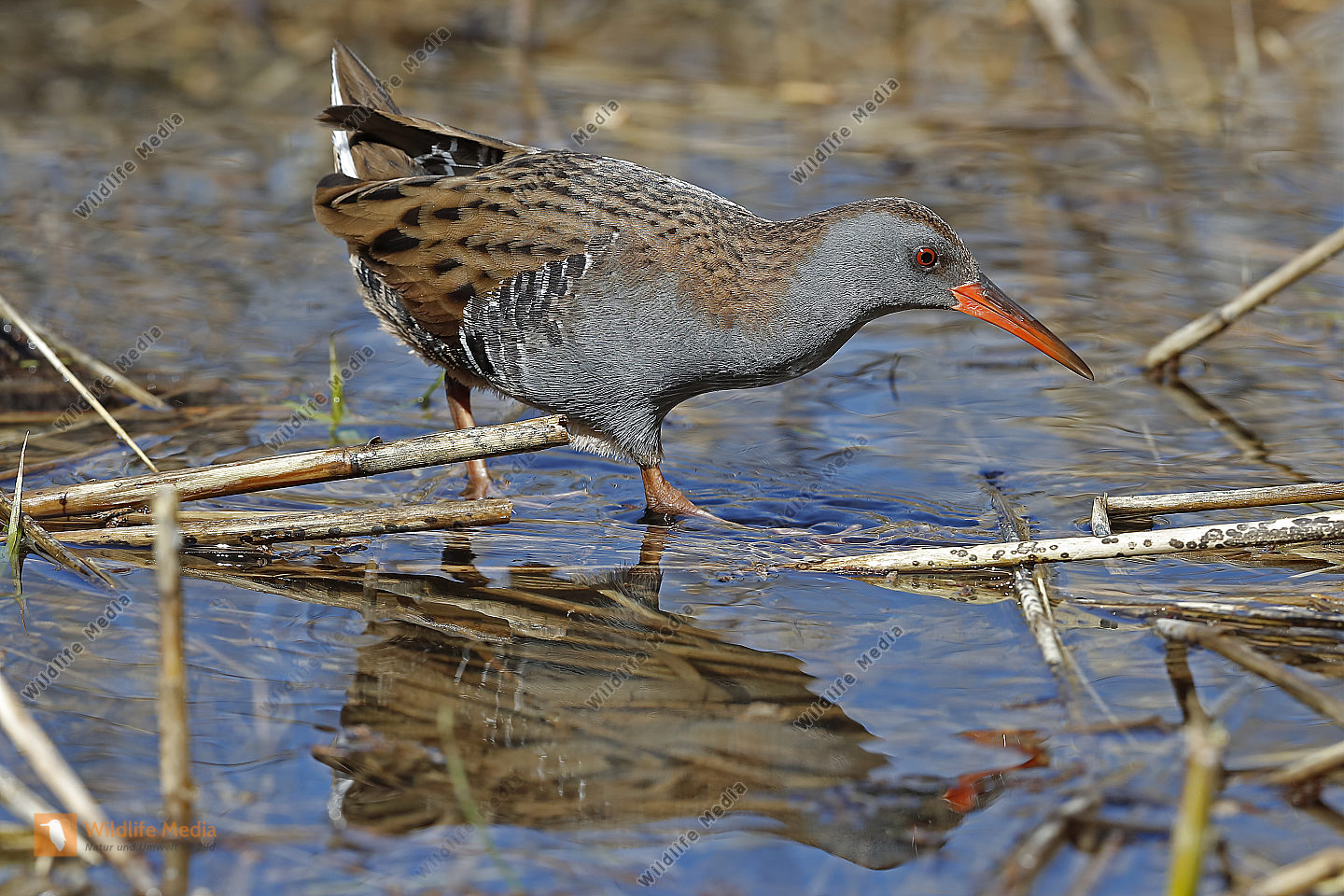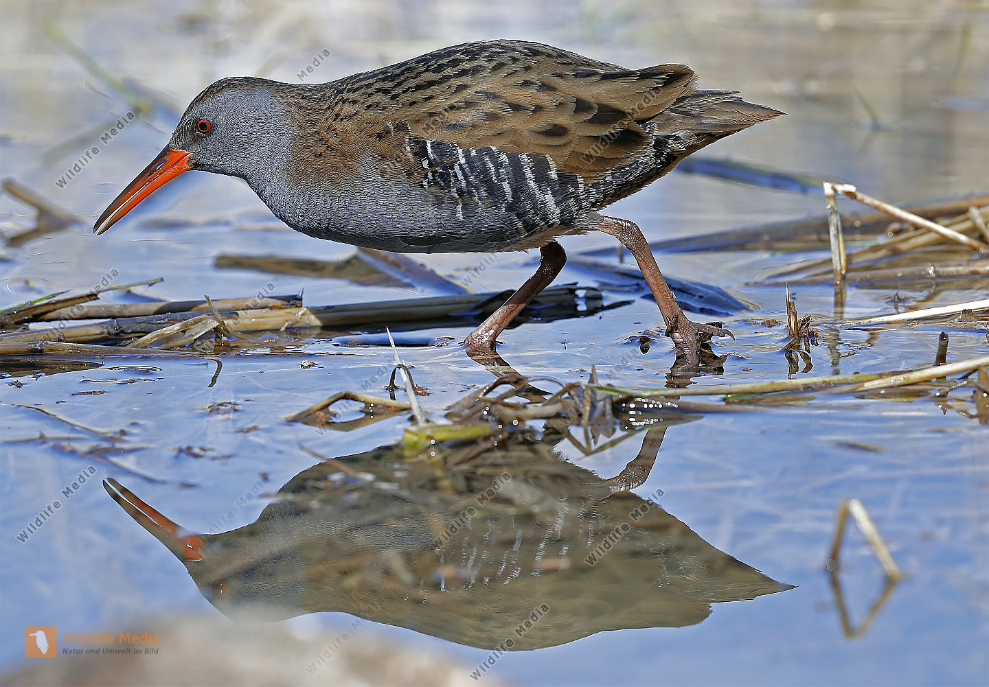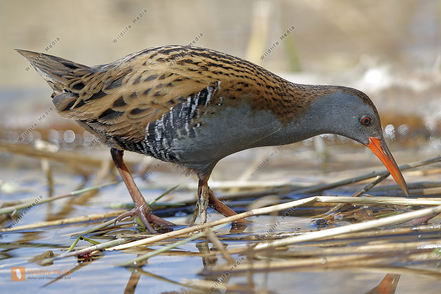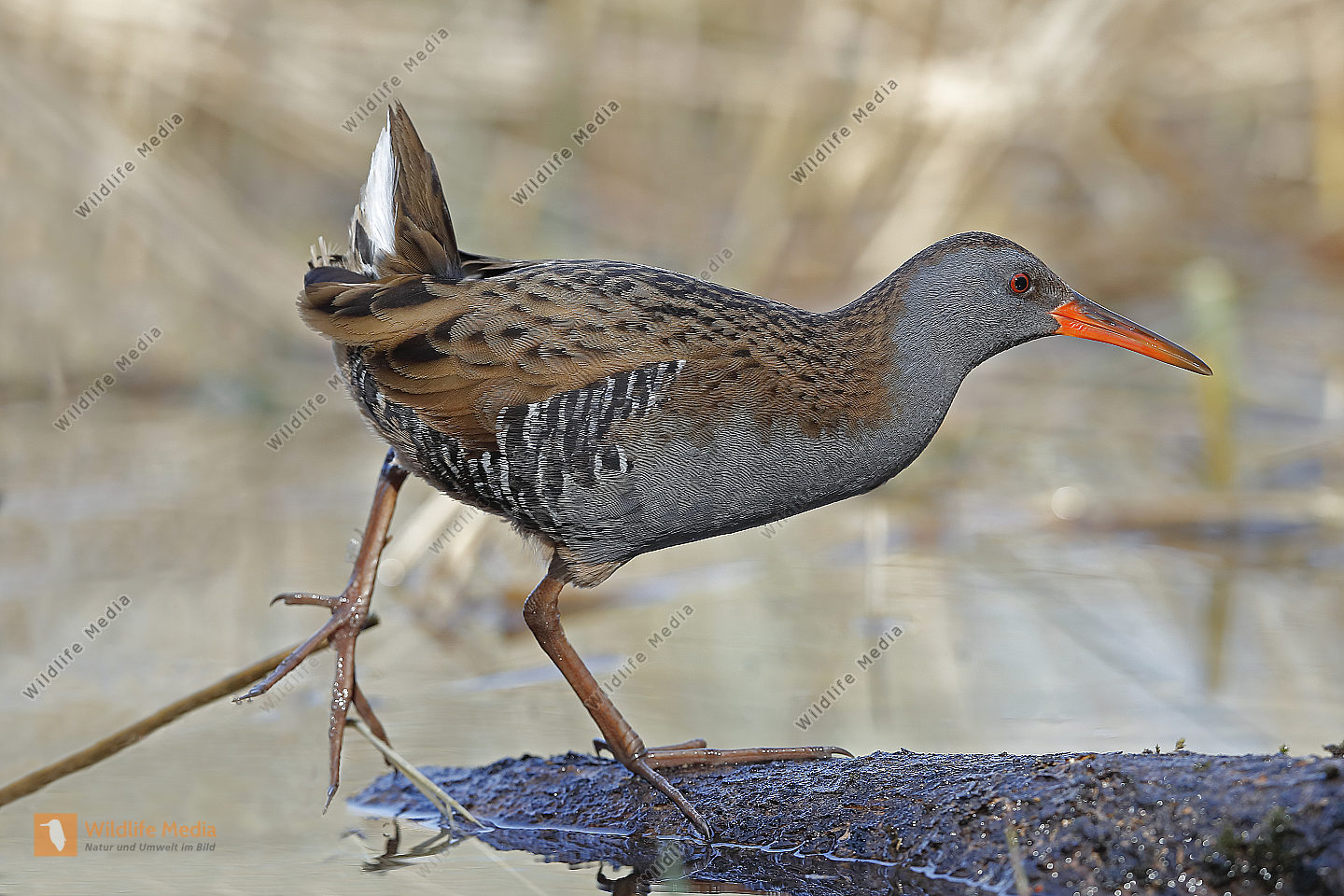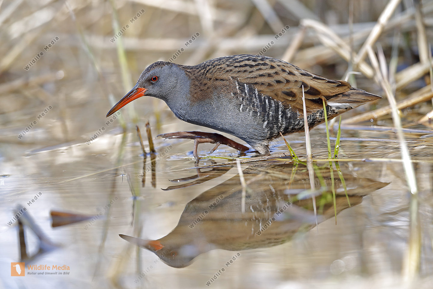 Eine scheue Wasserralle hat sich aus ihrem Versteck gewagt. Sie watet durch das Wasser des Erbach un