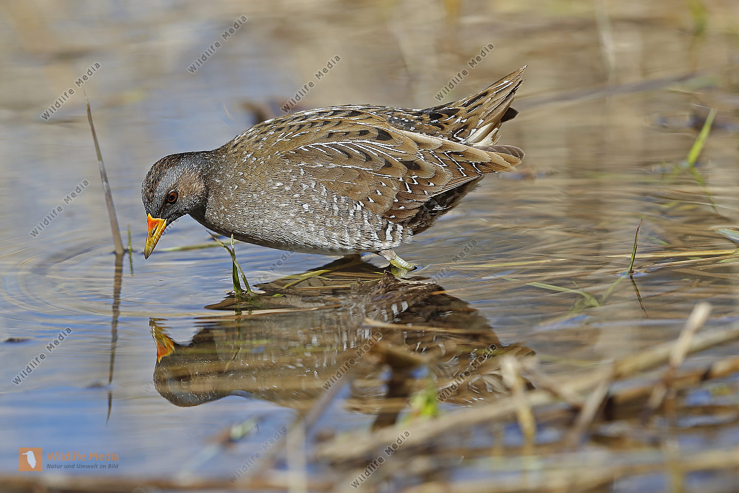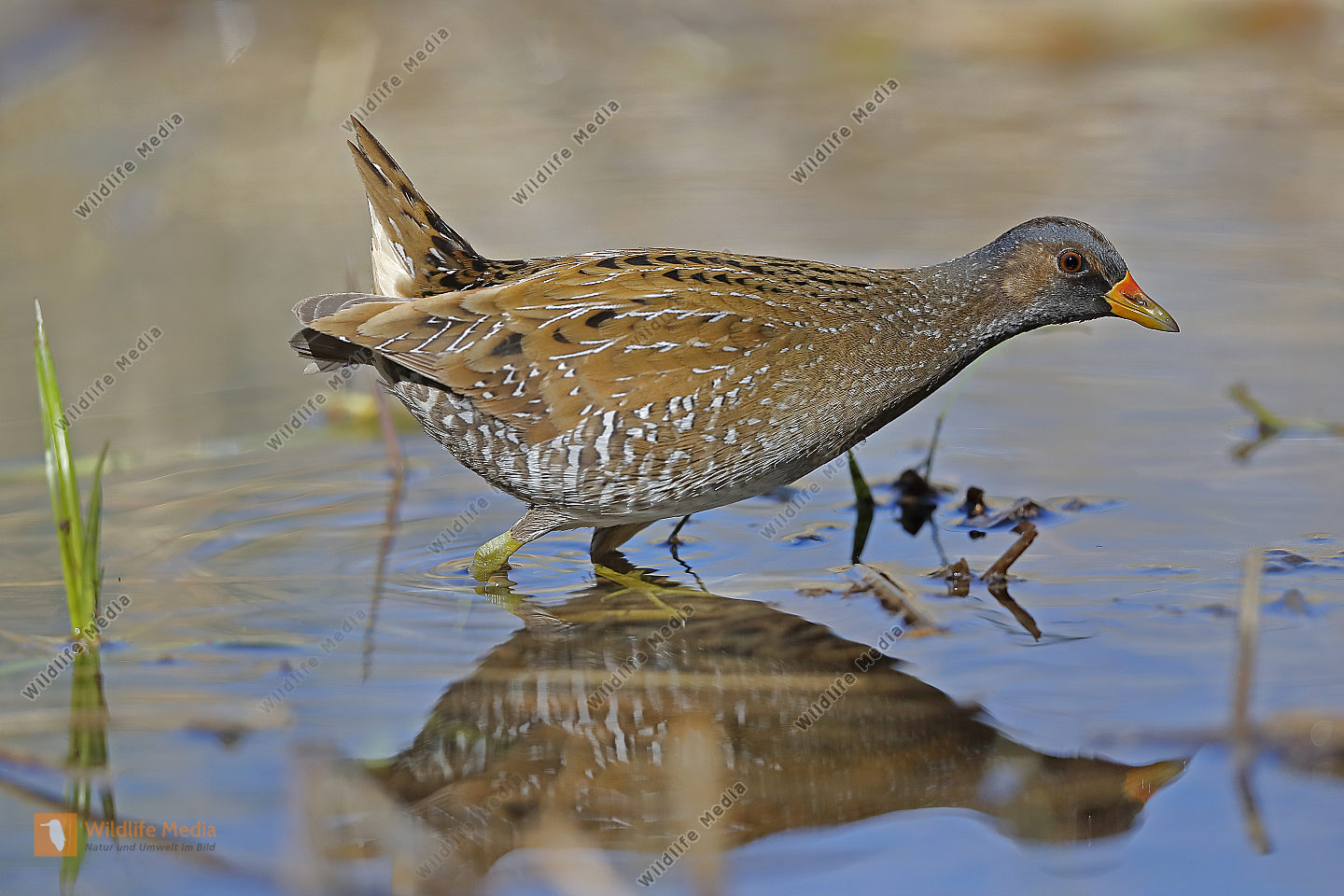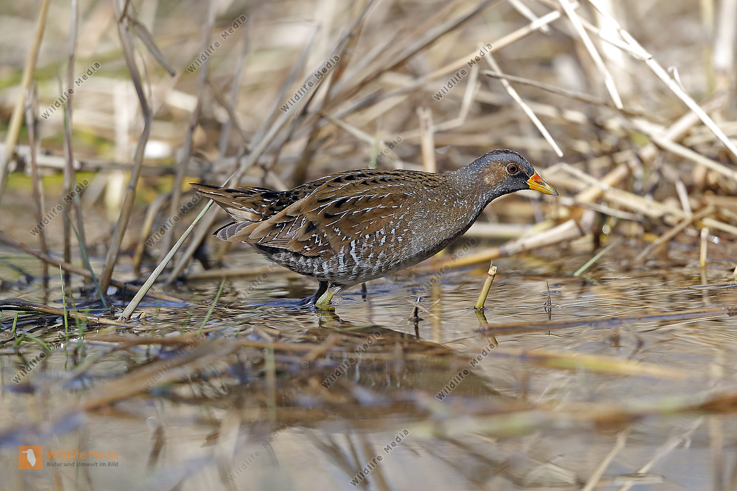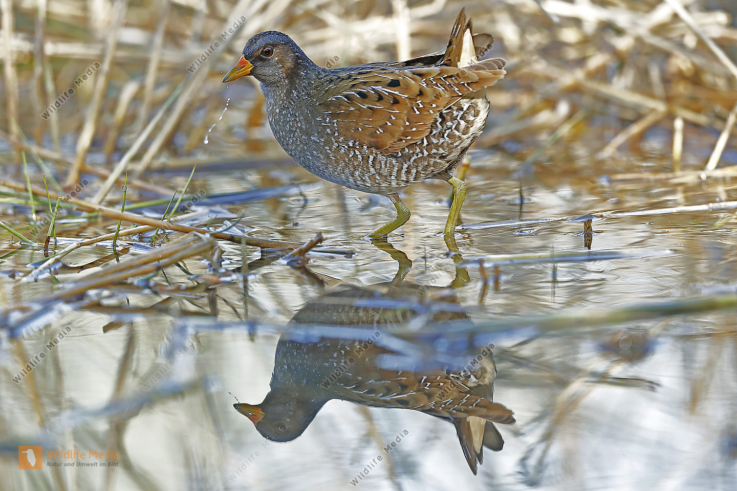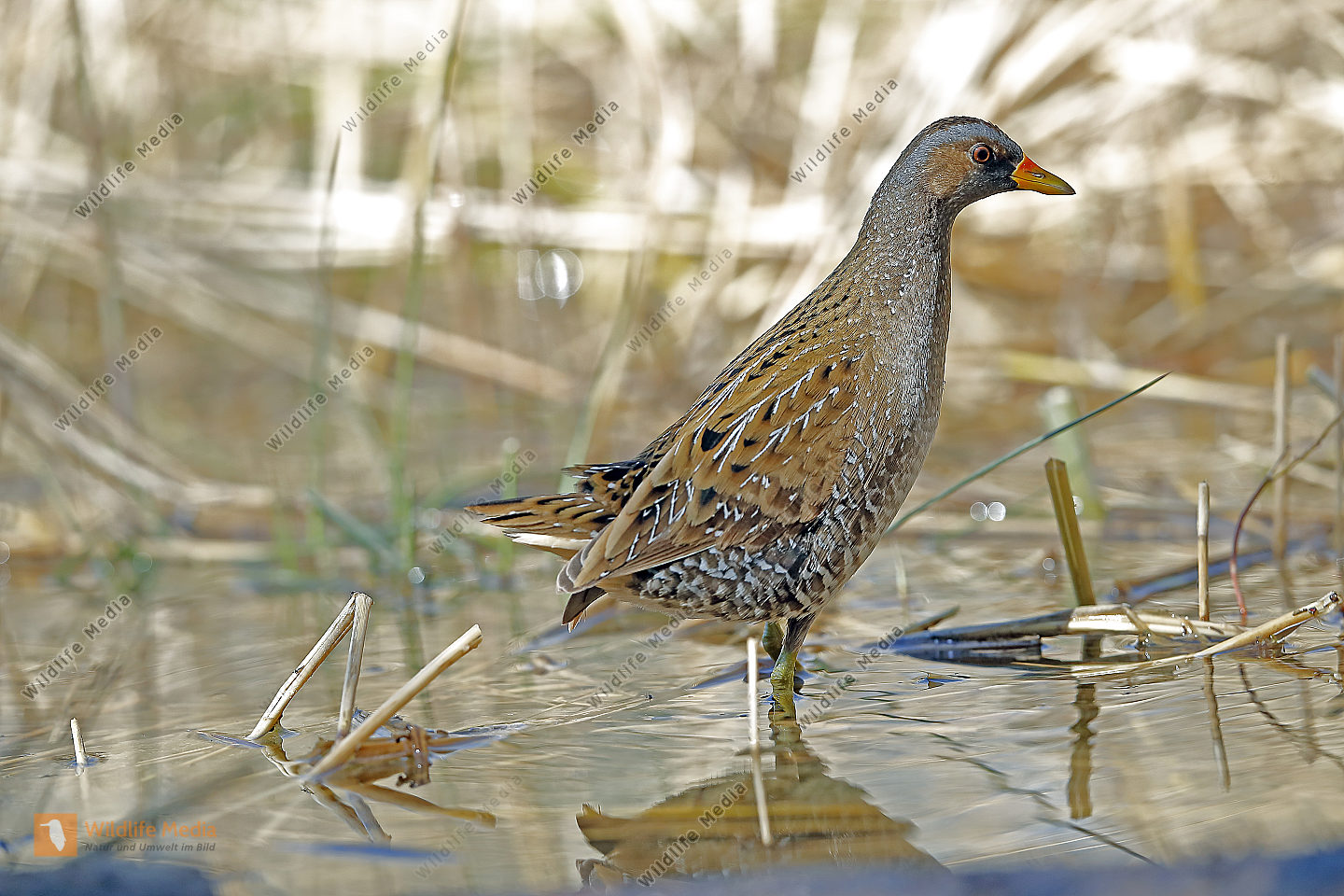 Eine scheue Wasserralle hat sich aus ihrem Versteck gewagt. Sie watet durch das Wasser des Erbach un