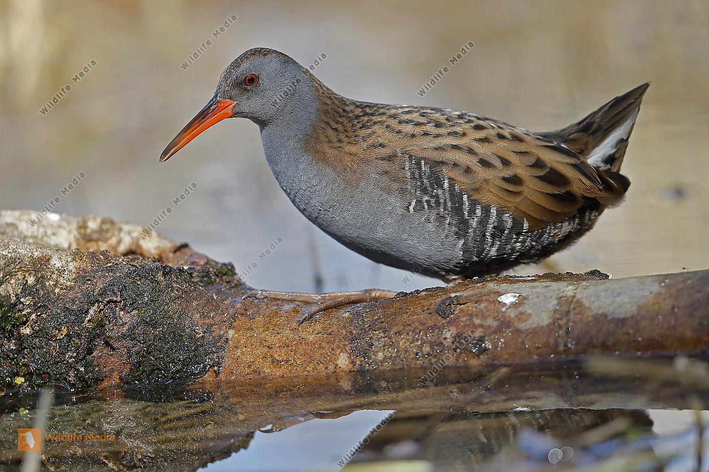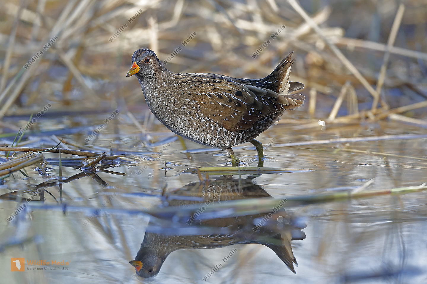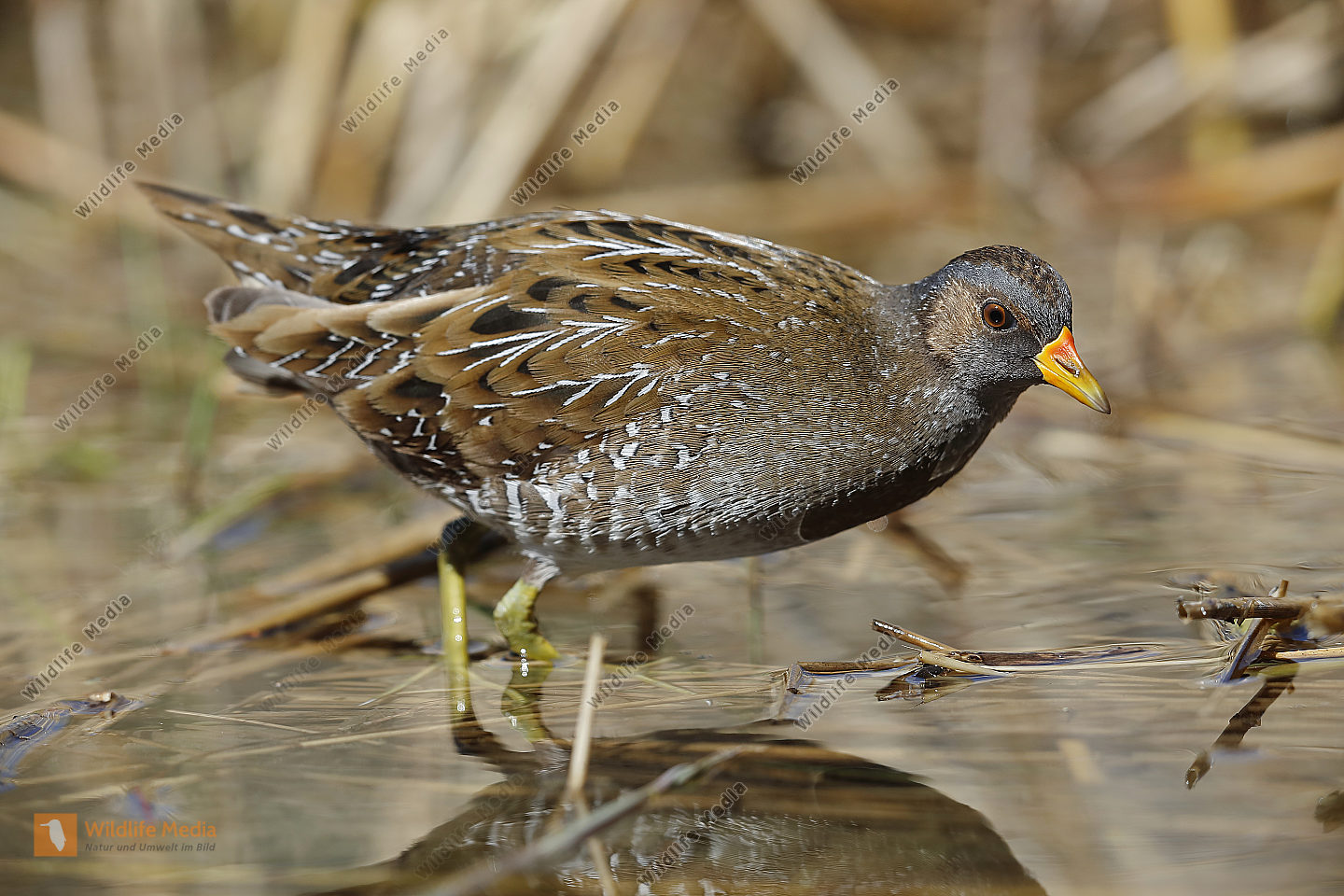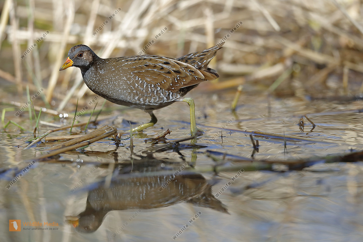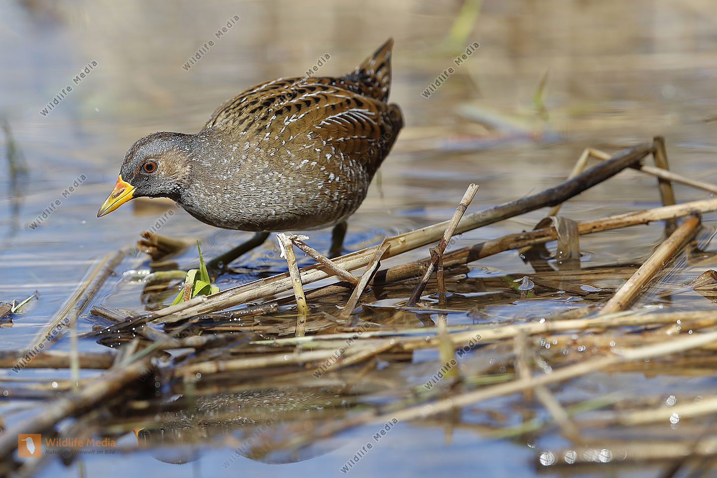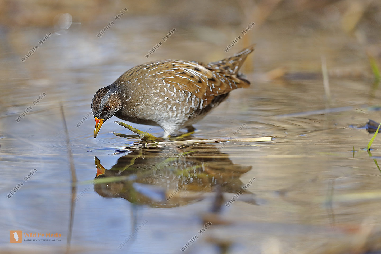 Eine scheue Wasserralle hat sich aus ihrem Versteck gewagt. Sie watet durch das Wasser des Erbach un