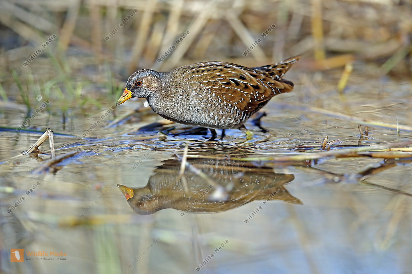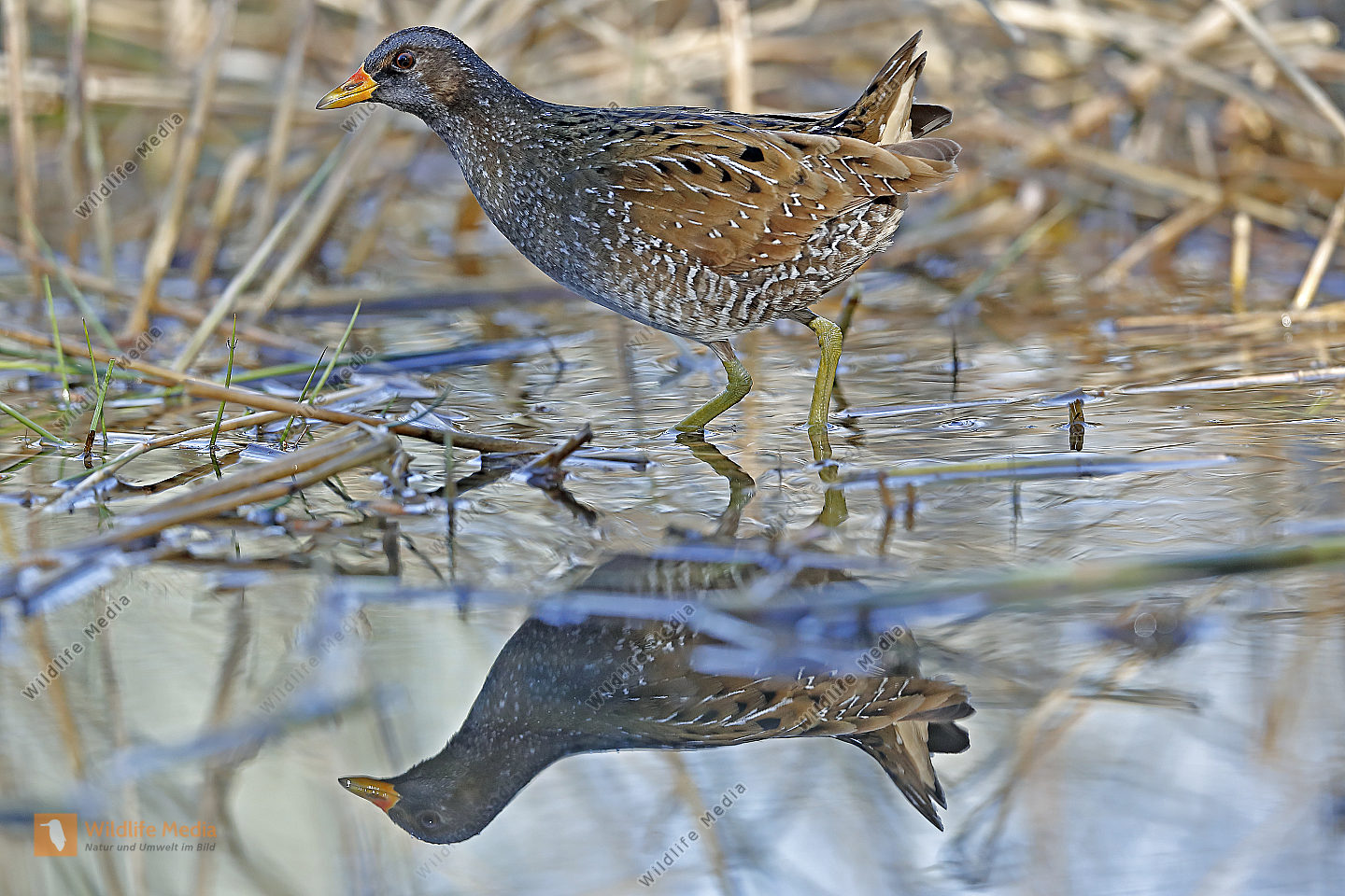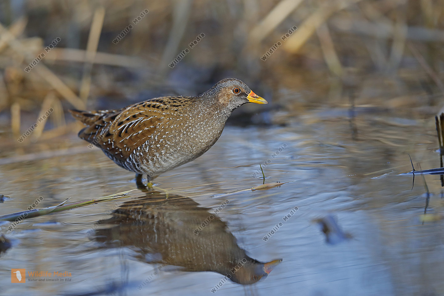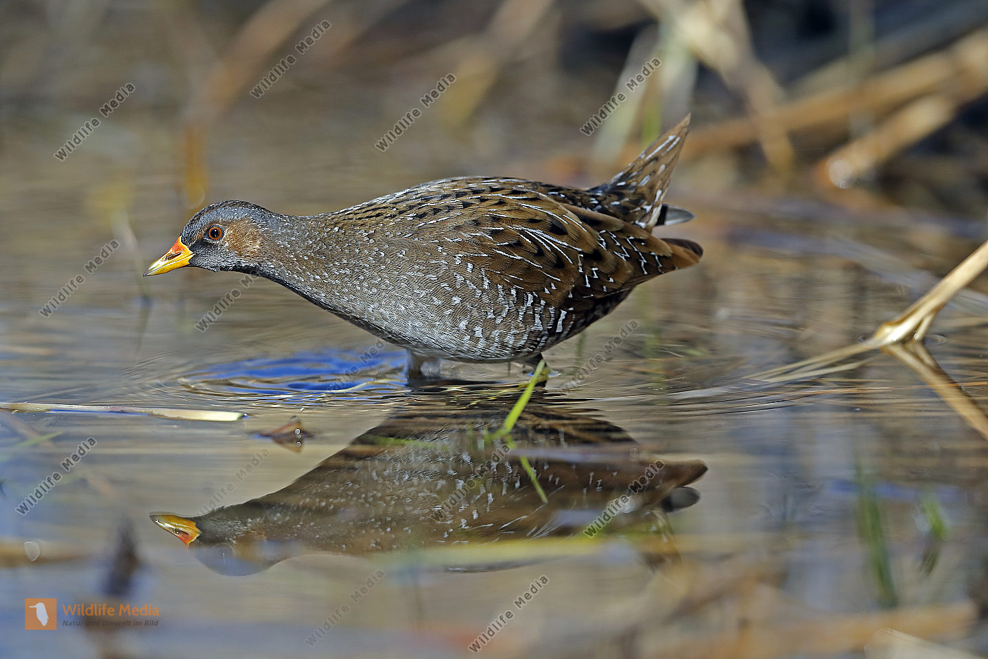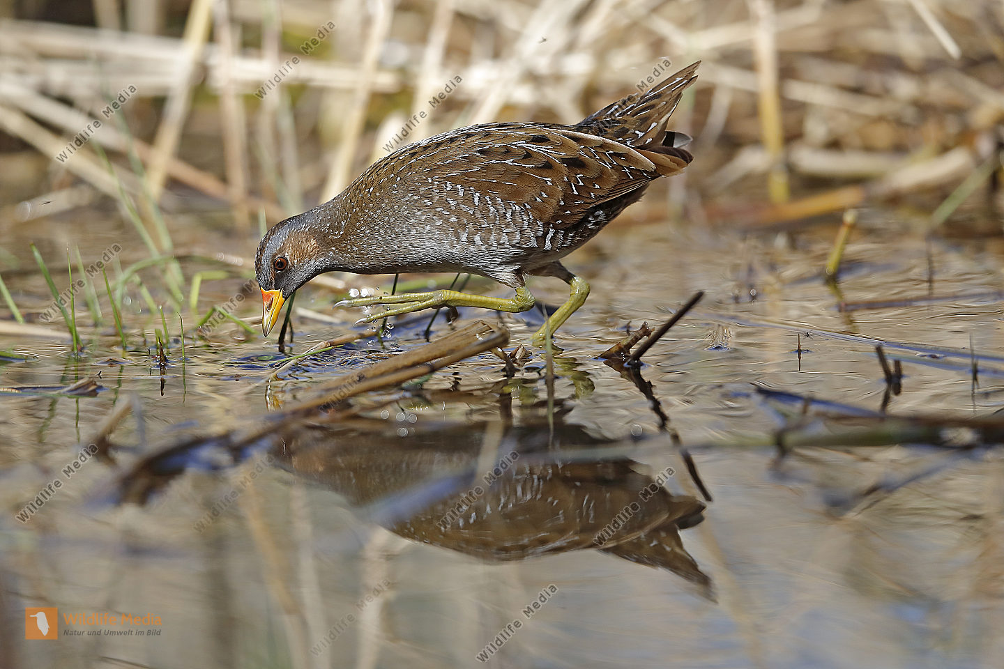 Eine scheue Wasserralle hat sich aus ihrem Versteck gewagt. Sie watet durch das Wasser des Erbach un