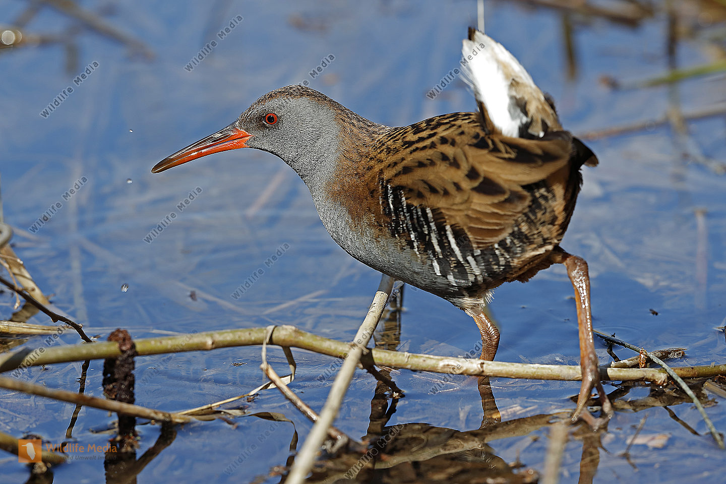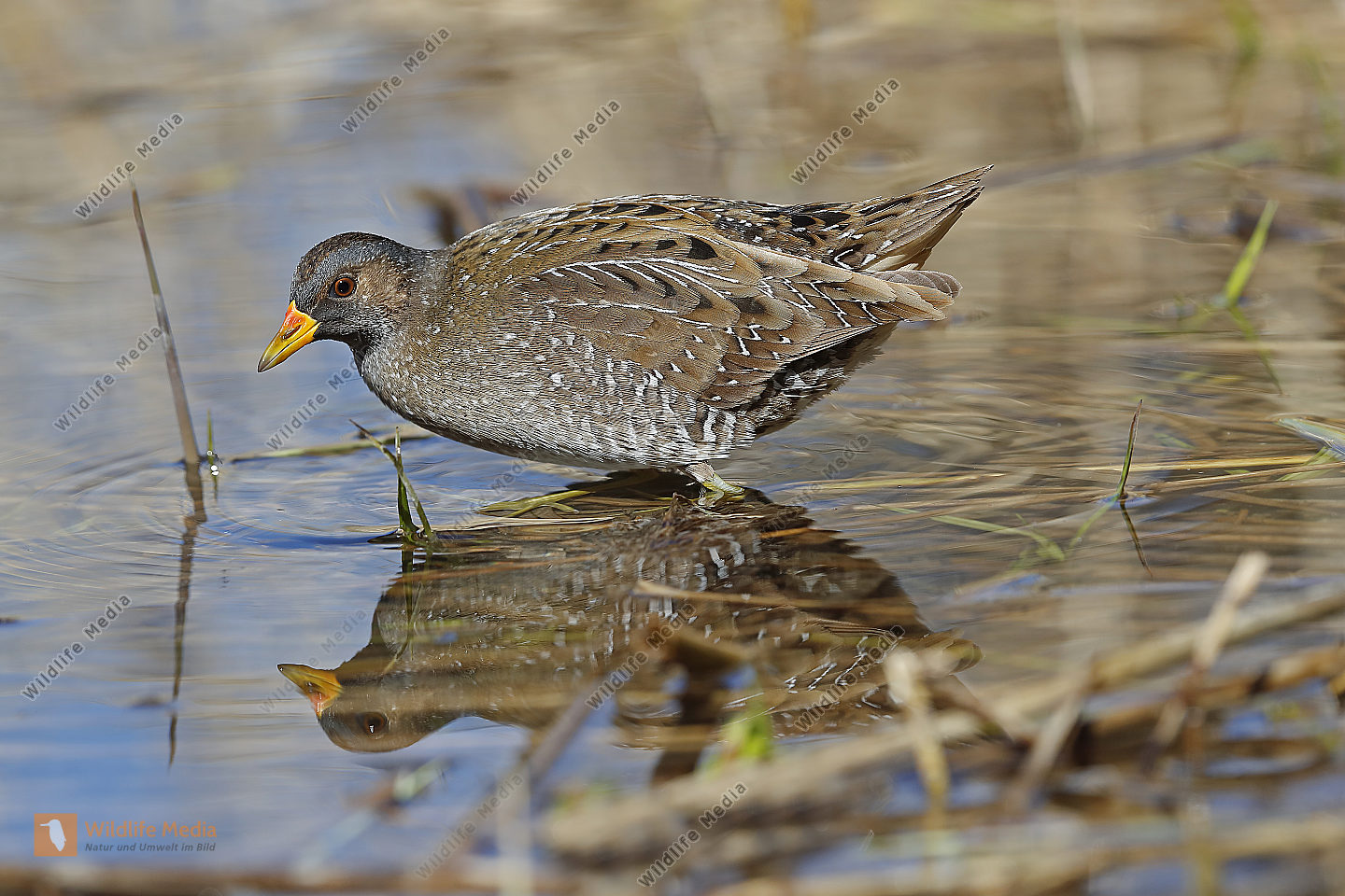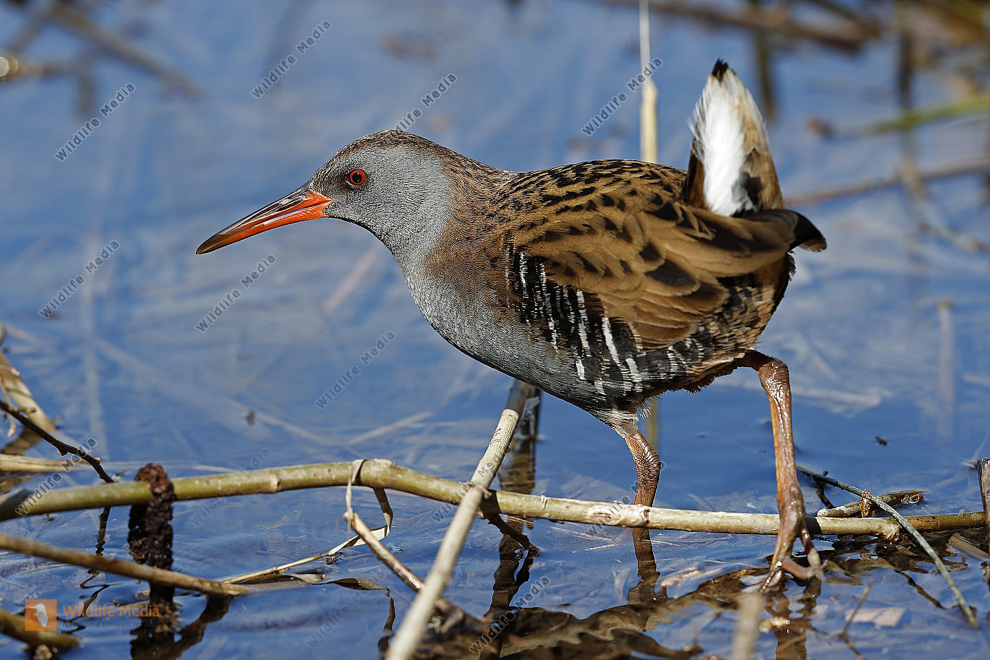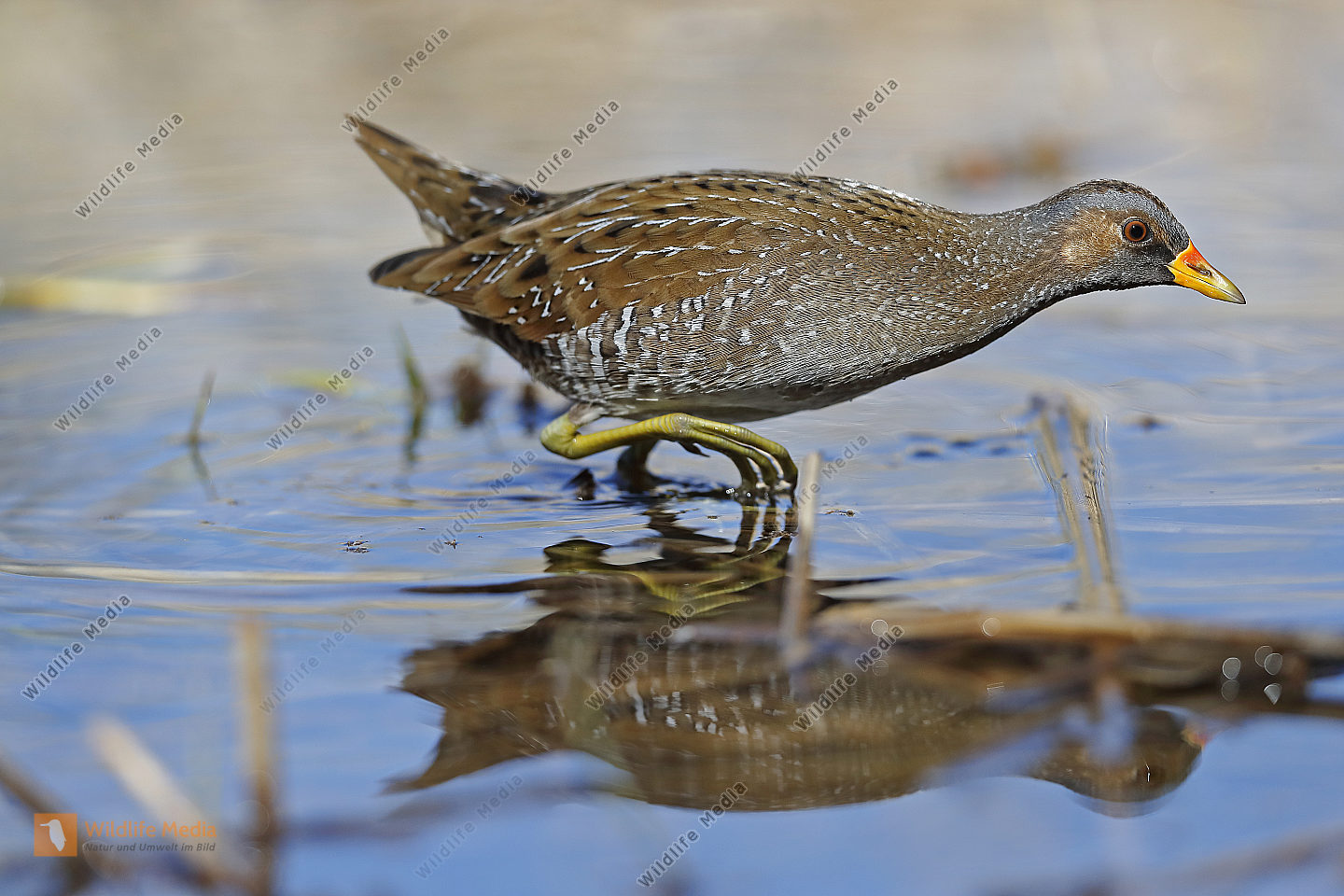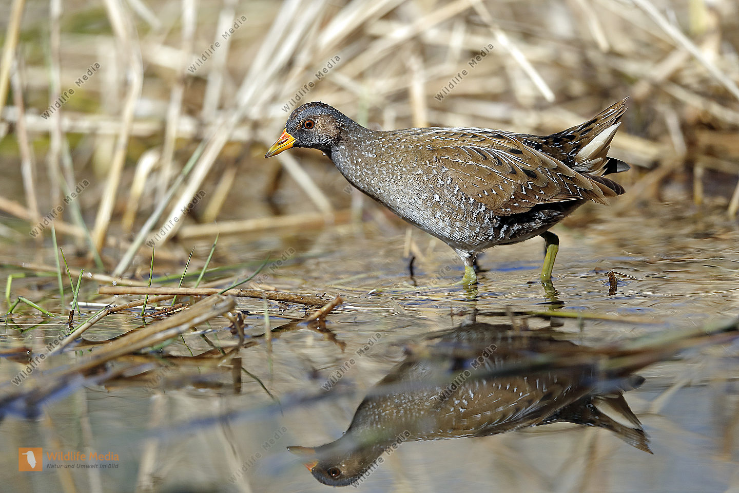 Eine scheue Wasserralle hat sich aus ihrem Versteck gewagt. Sie watet durch das Wasser des Erbach un