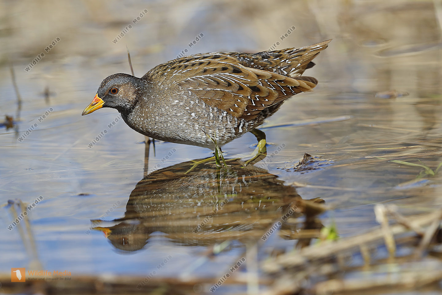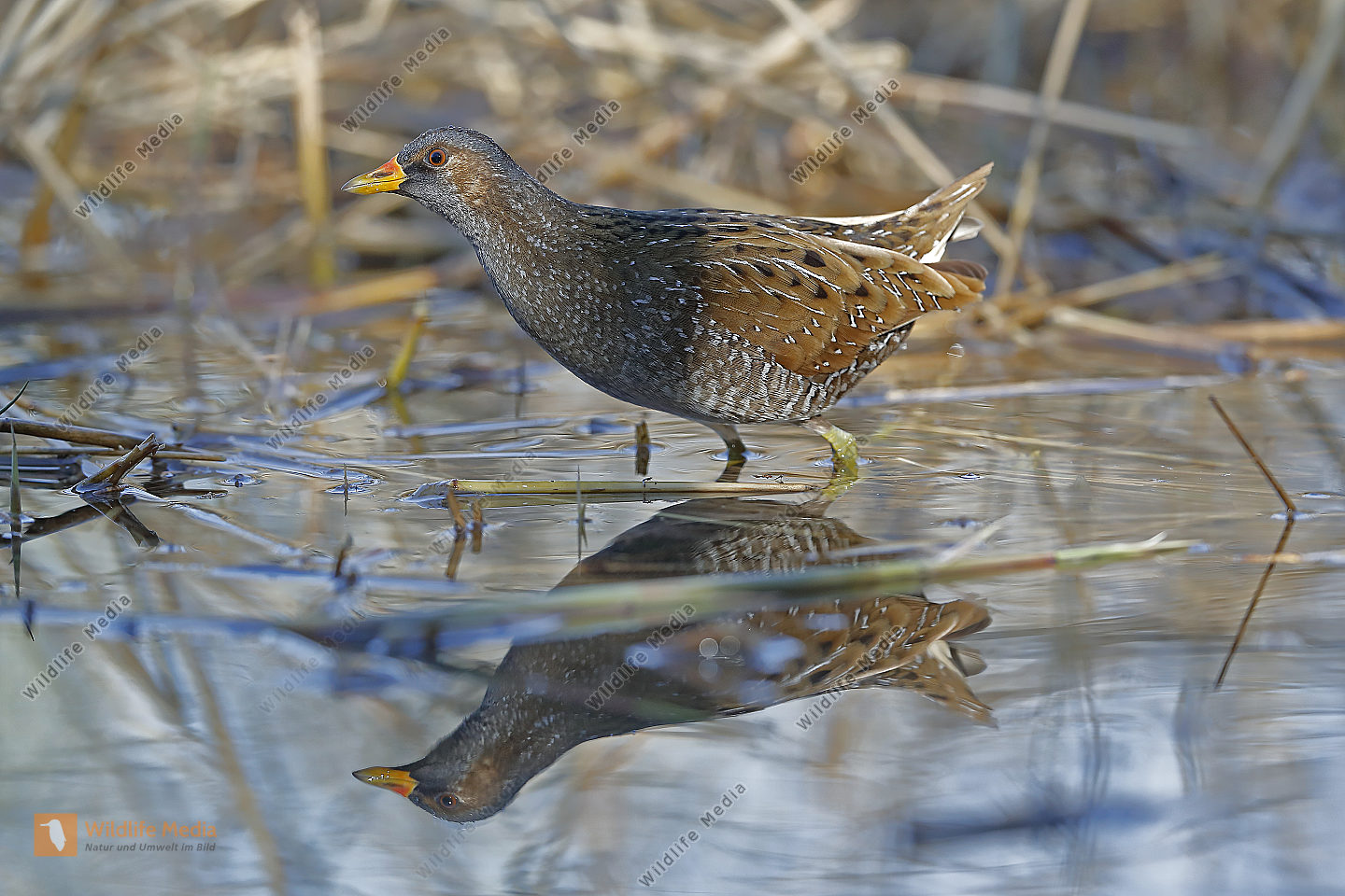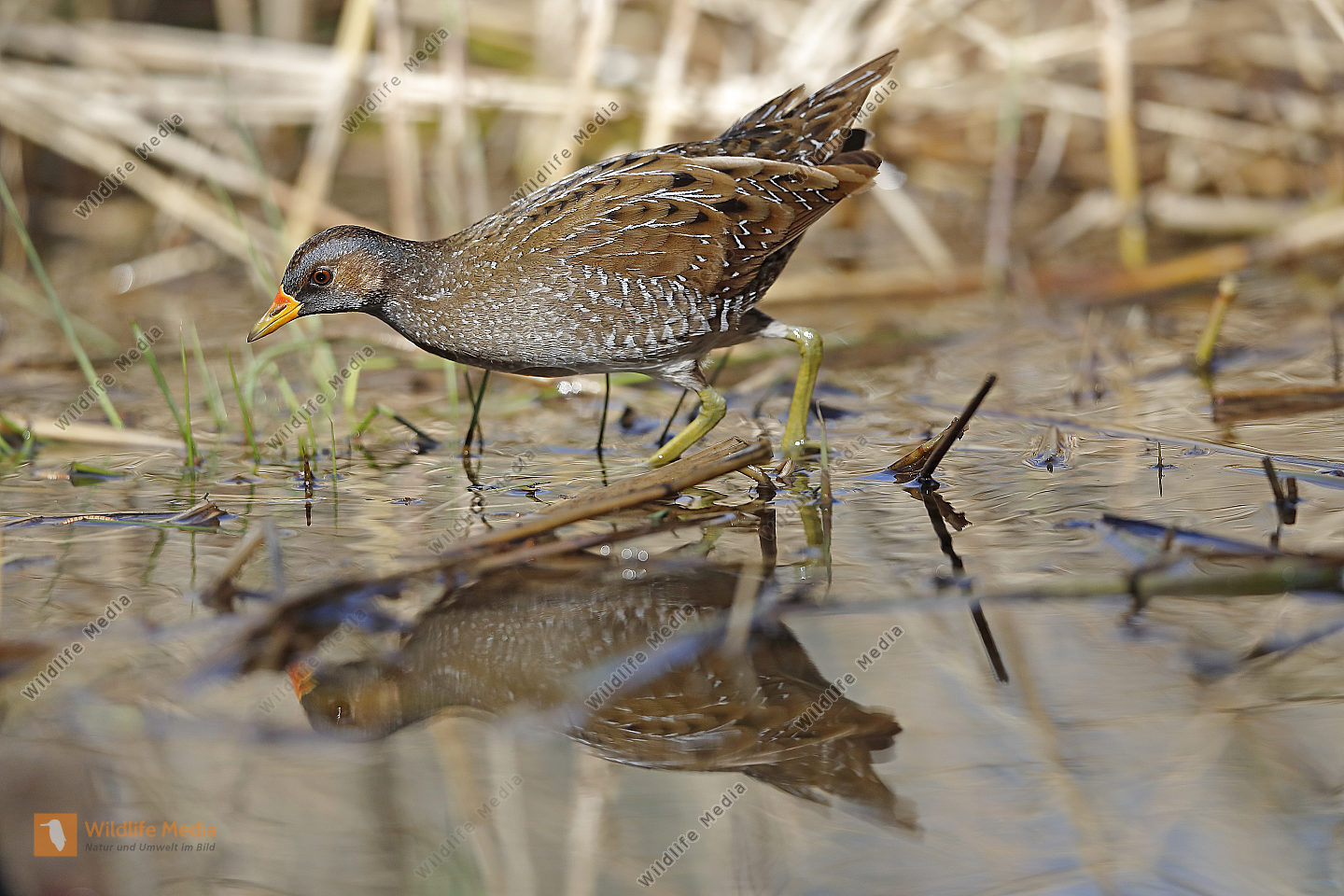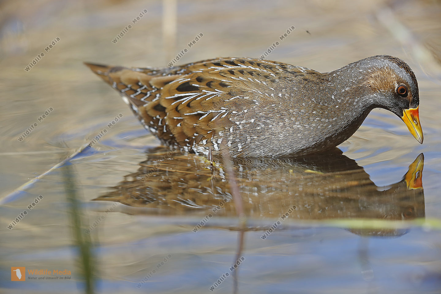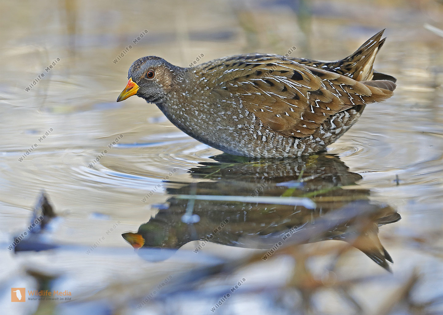 Eine scheue Wasserralle hat sich aus ihrem Versteck gewagt. Sie watet durch das Wasser des Erbach un