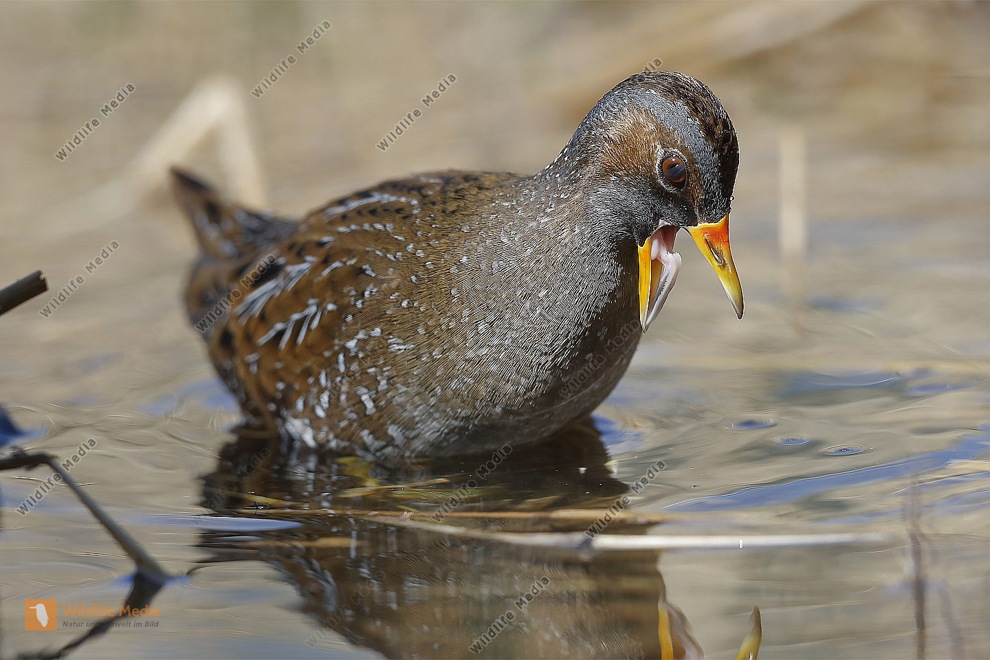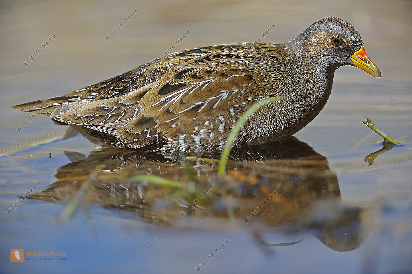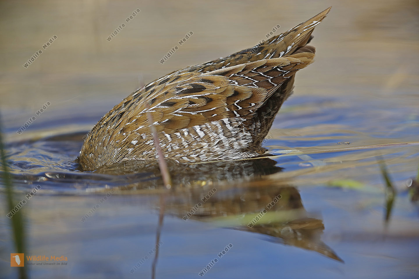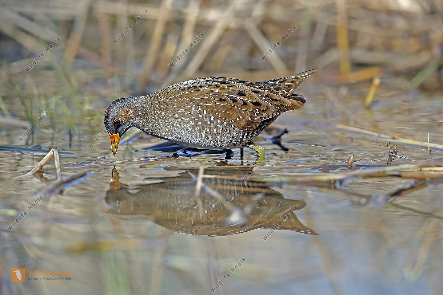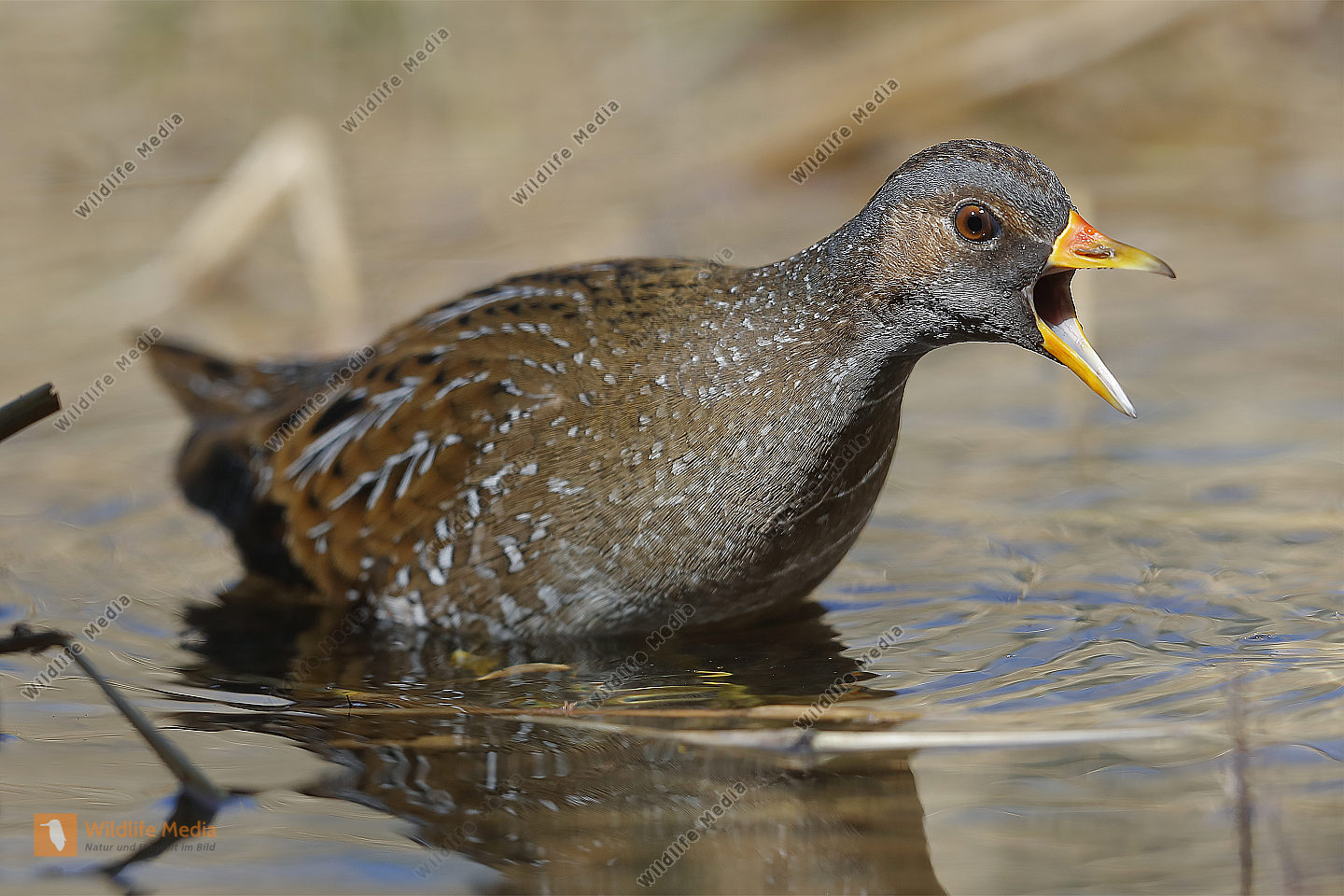 Eine scheue Wasserralle hat sich aus ihrem Versteck gewagt. Sie watet durch das Wasser des Erbach un