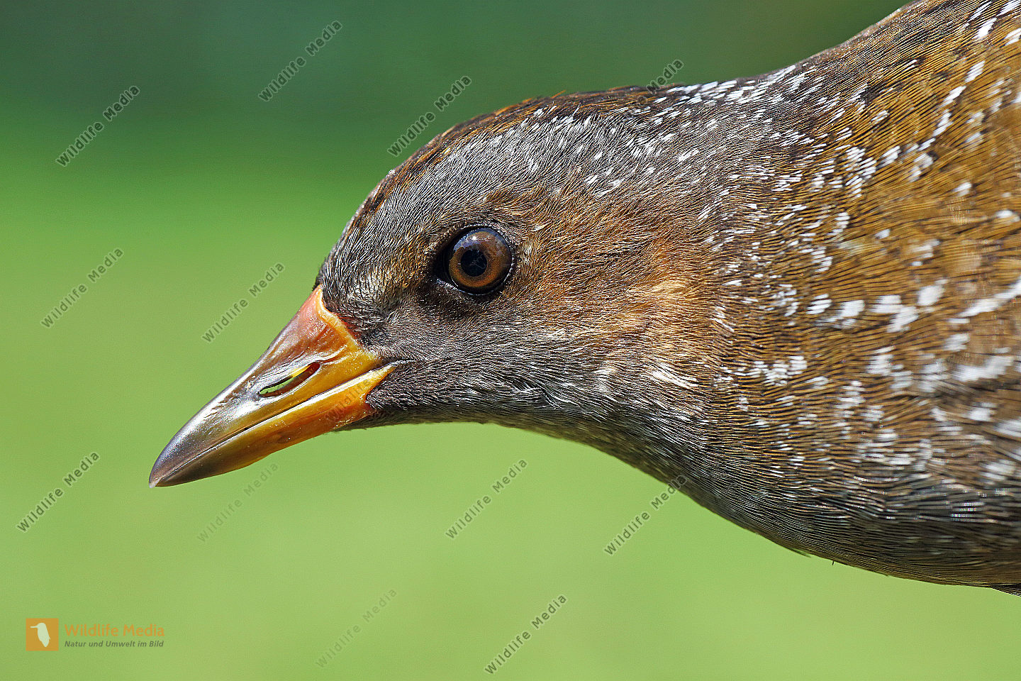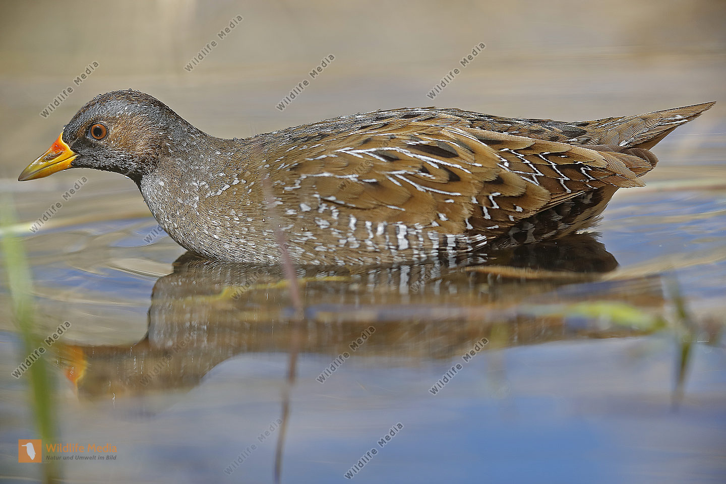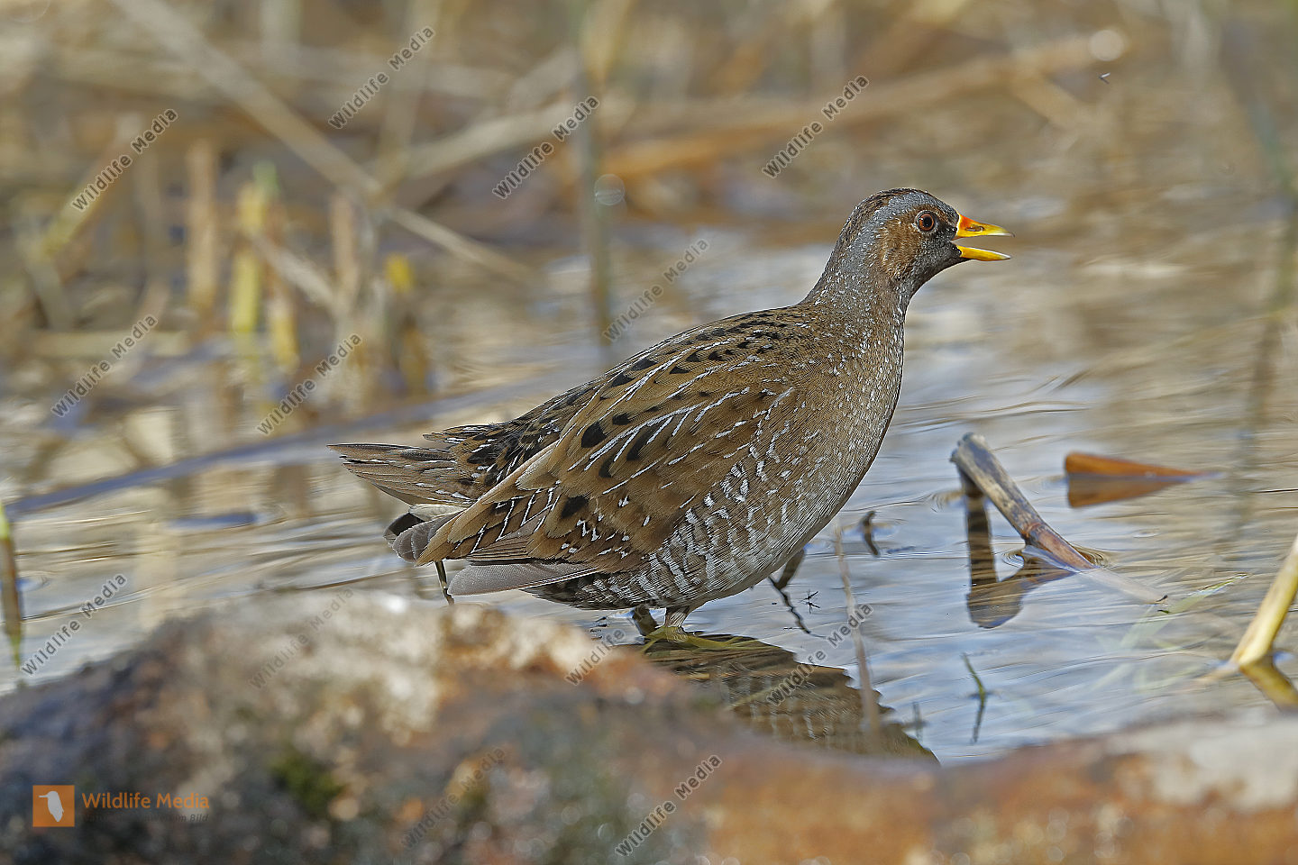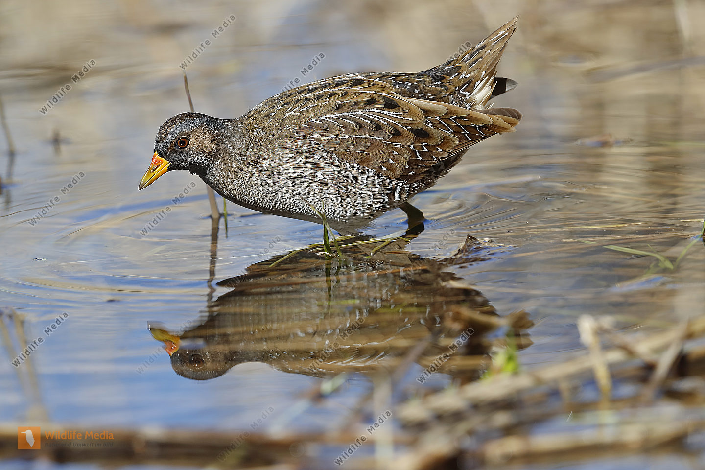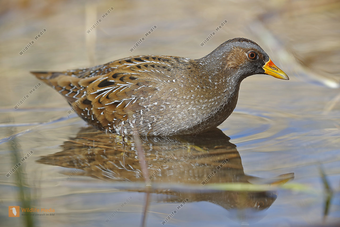 Eine scheue Wasserralle hat sich aus ihrem Versteck gewagt. Sie watet durch das Wasser des Erbach un