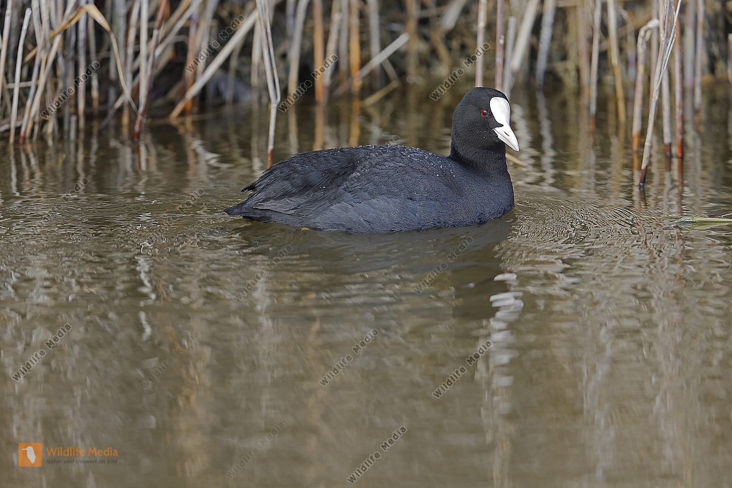 Ein Blässhuhn auf einem Weiher bei Homburg