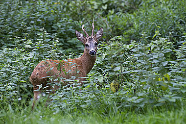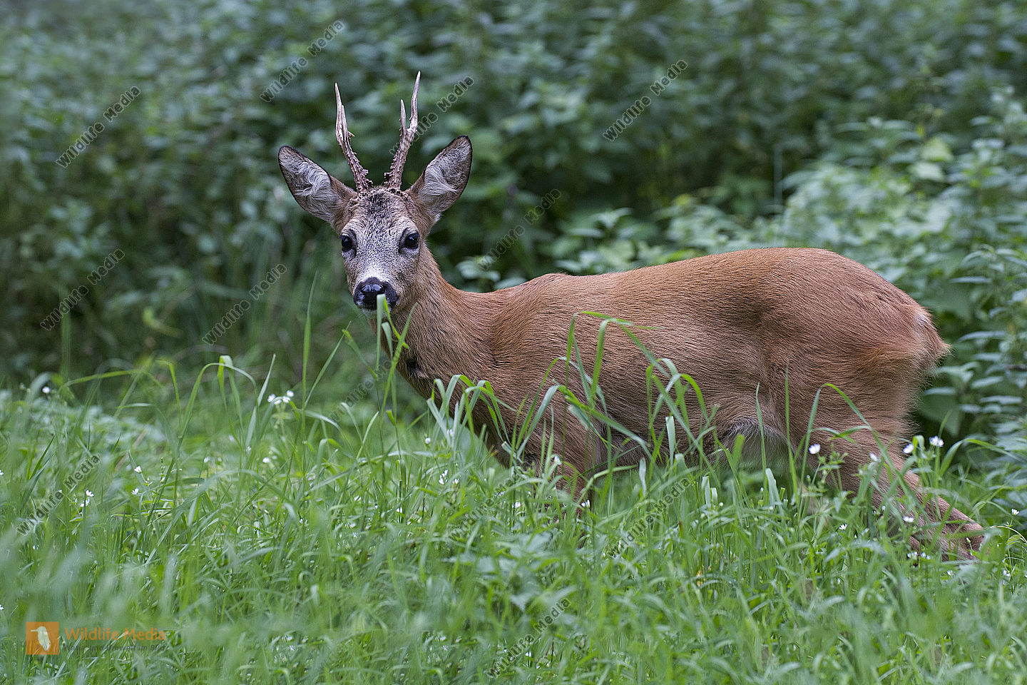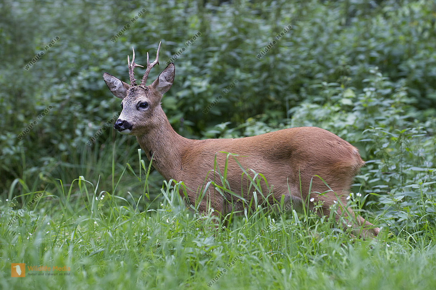Rehbock Capreolus capreolus auf einer blühenden Wiese