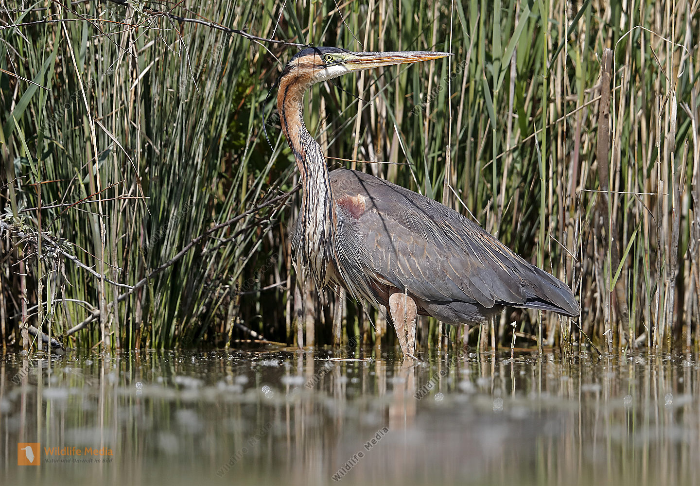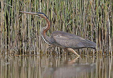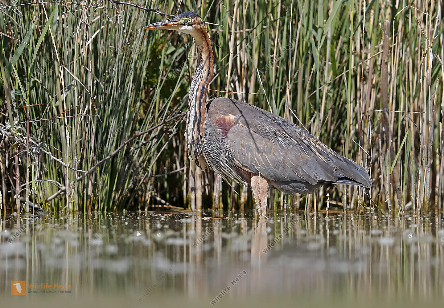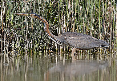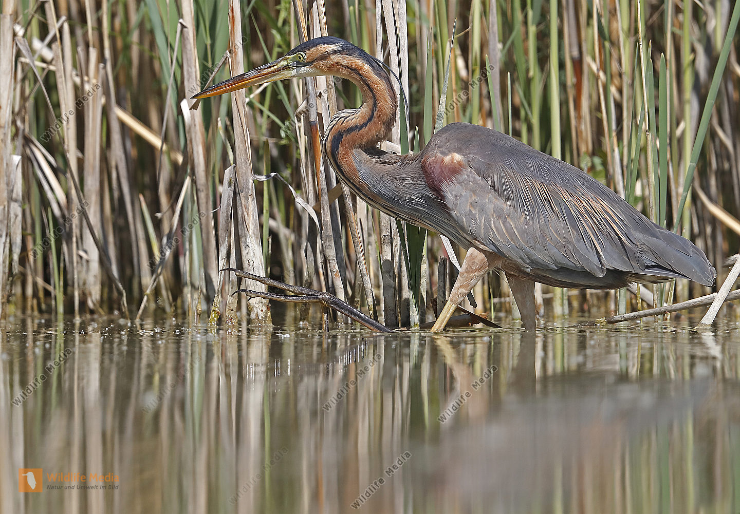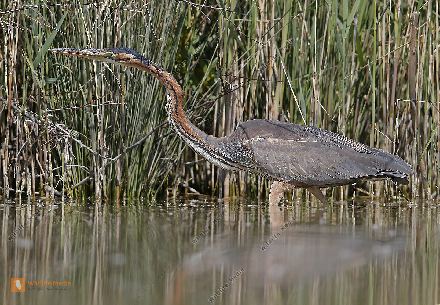 Ein Graureiher auf der Suche nach Nahrung im Beeder Bruch