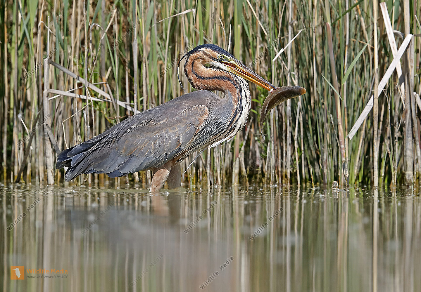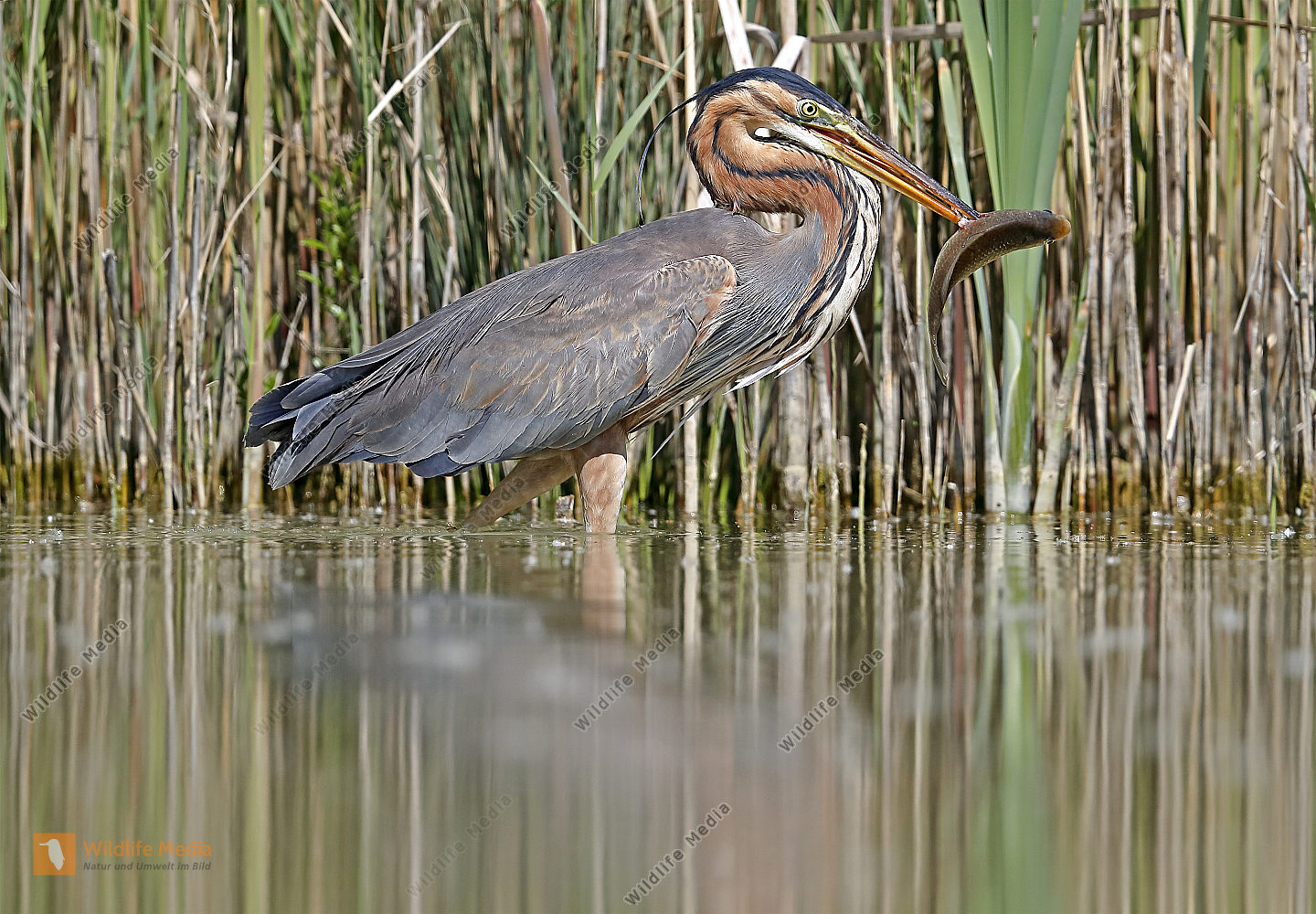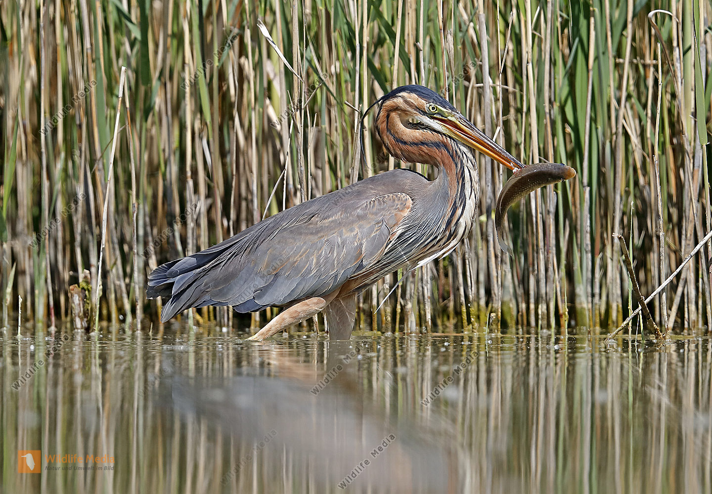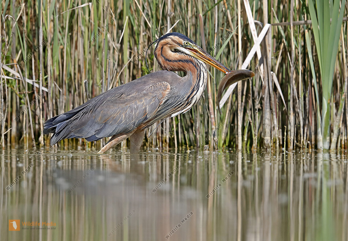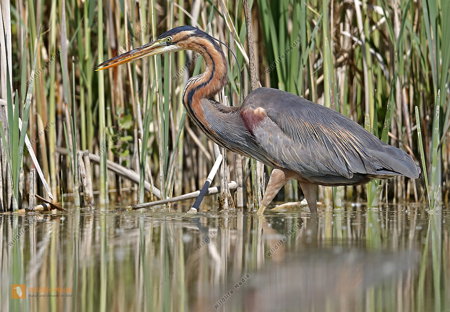 Ein Graureiher auf der Suche nach Nahrung im Beeder Bruch