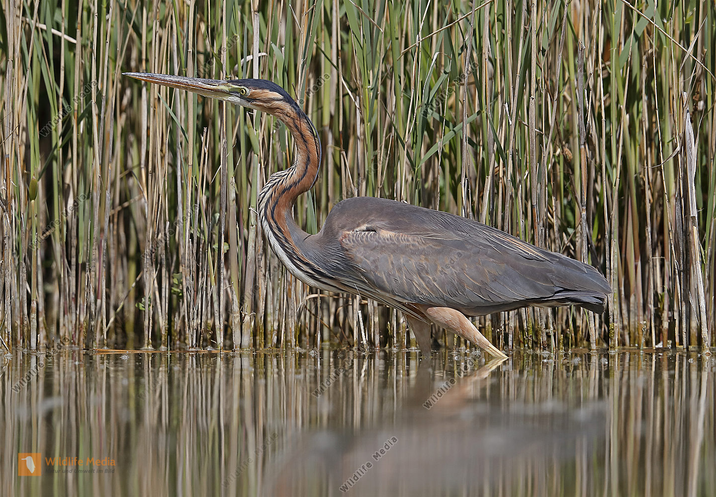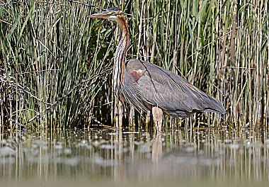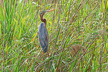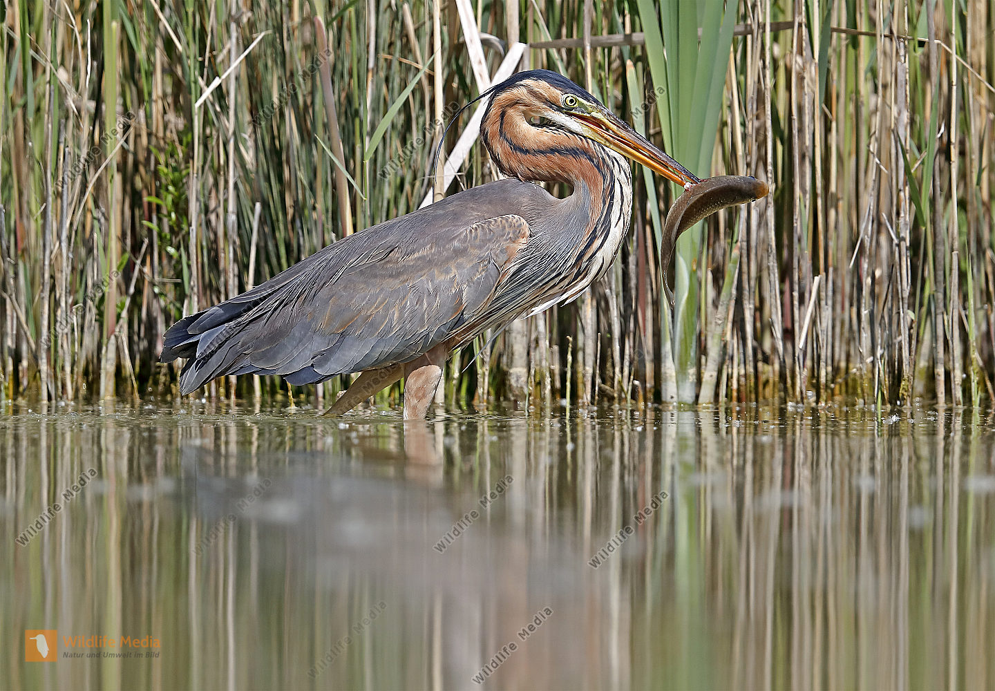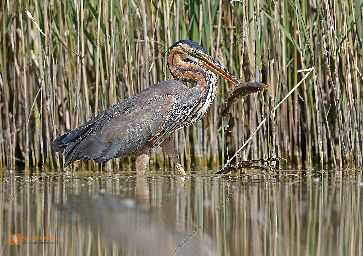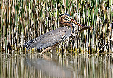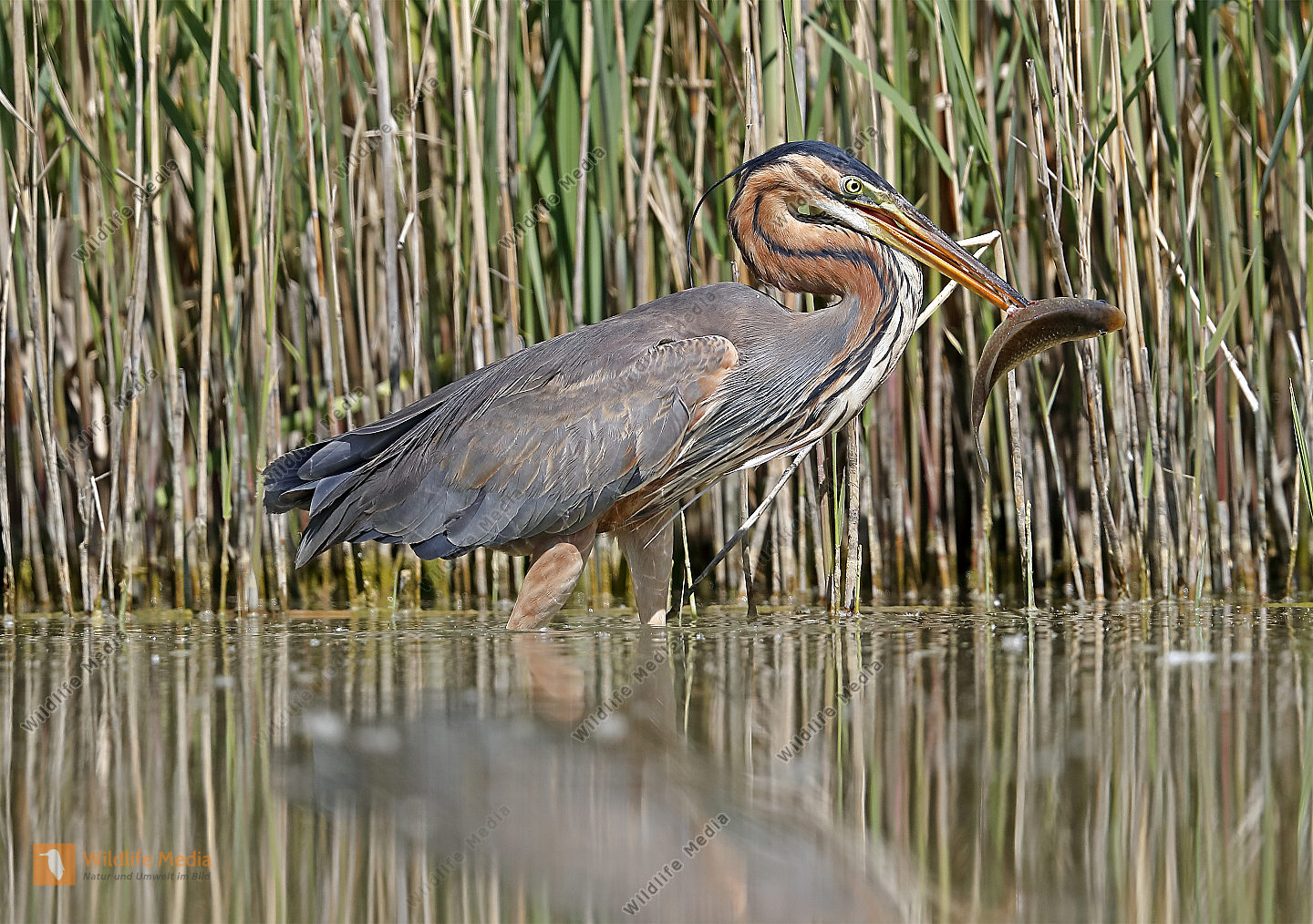 Ein Graureiher auf der Suche nach Nahrung im Beeder Bruch