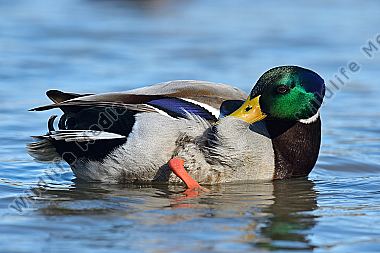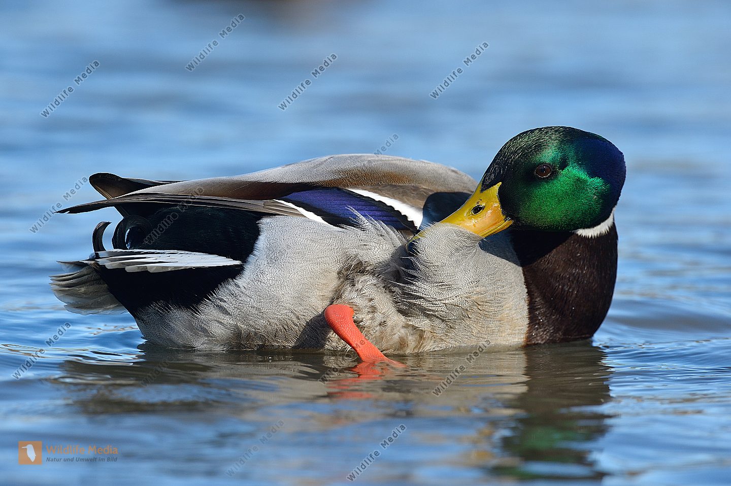 Eine männliche Krickente schwimmt auf dem Ökosee im saarländischen Dillingen
