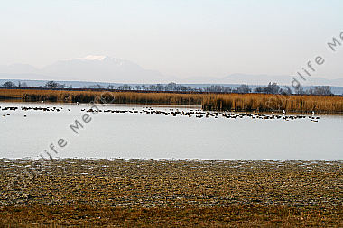 Nilgänse Alopochen aegyptiaca mit Jungen und Höckerschwan