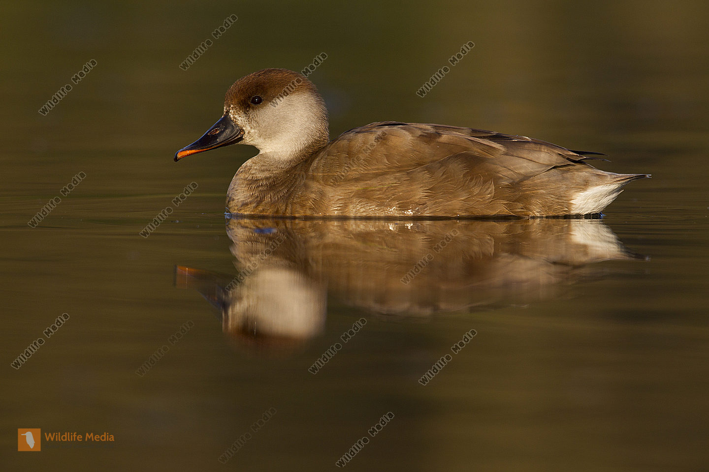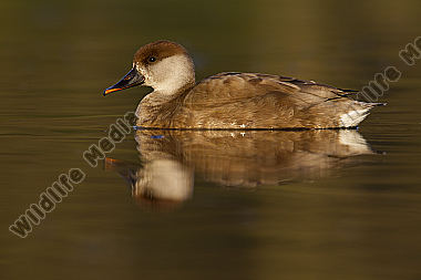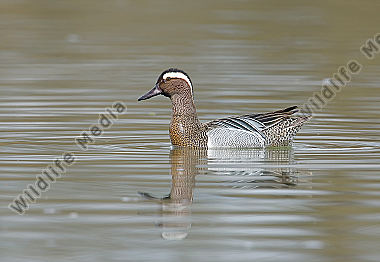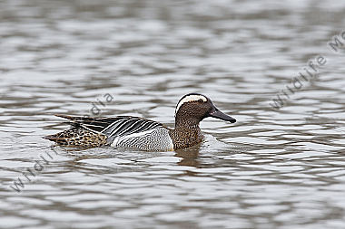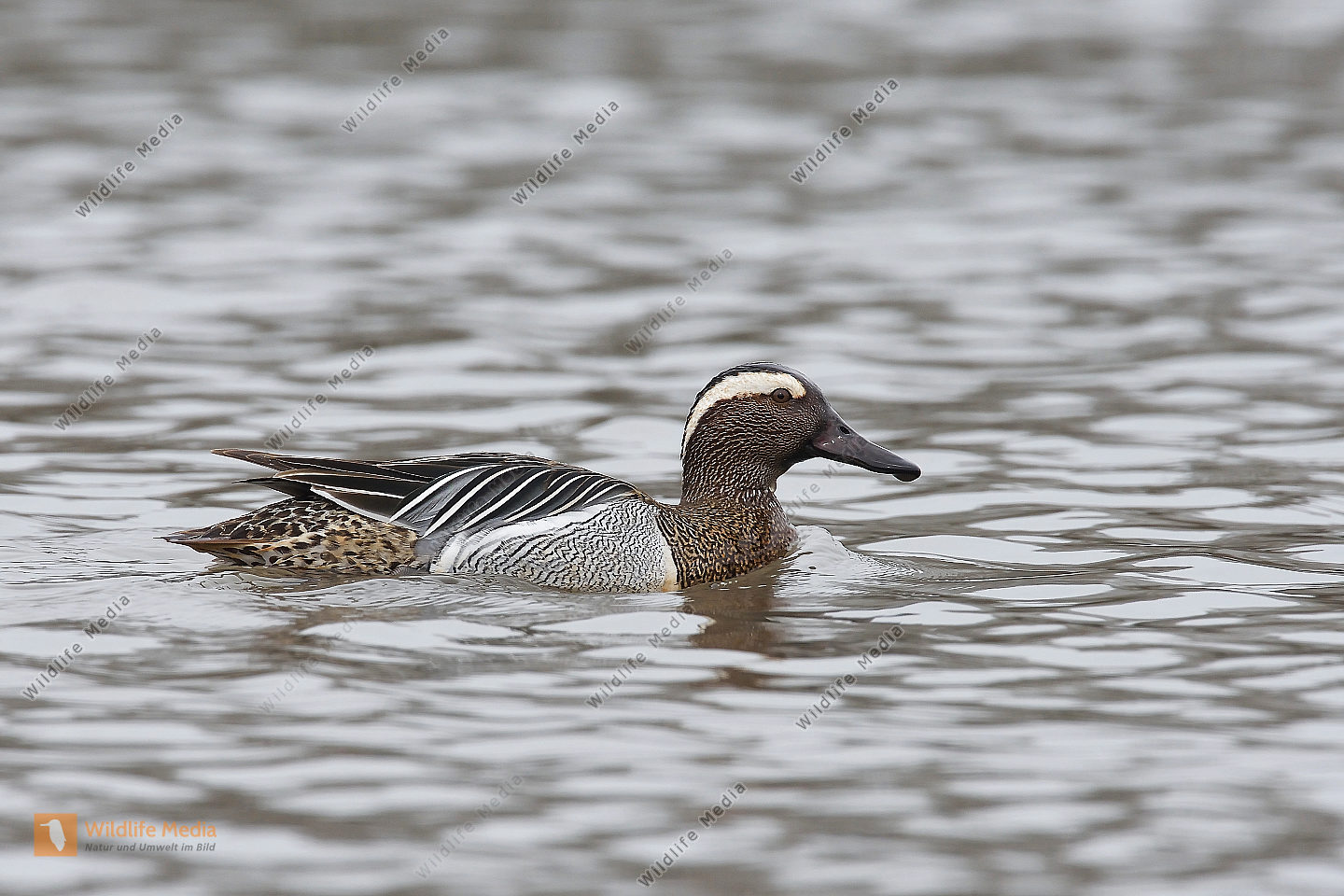 Eine männliche Krickente schwimmt auf dem Ökosee im saarländischen Dillingen