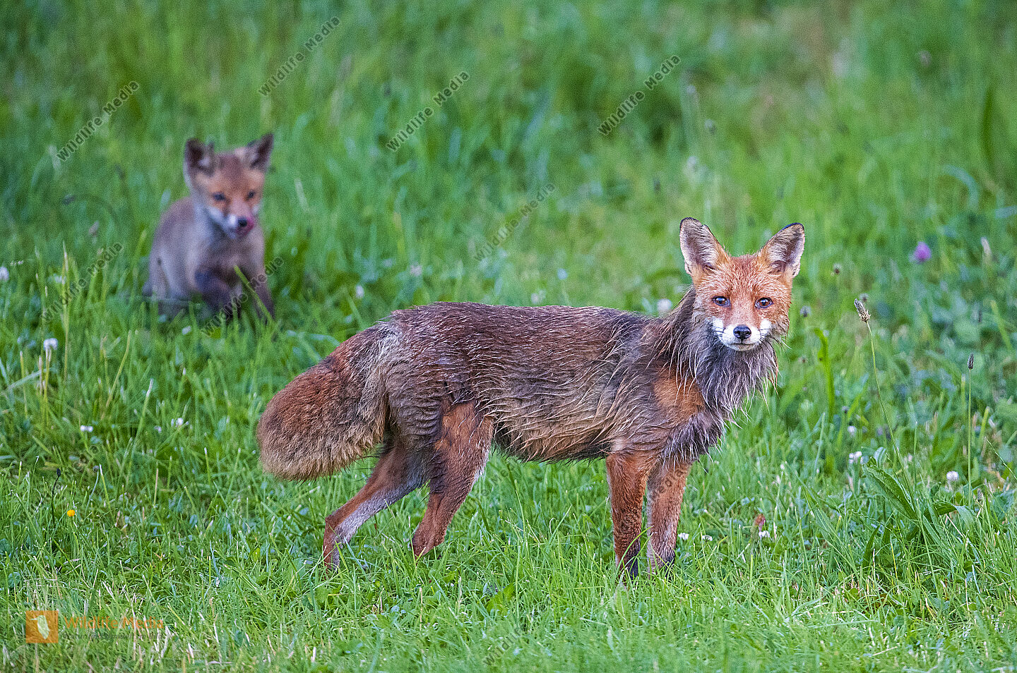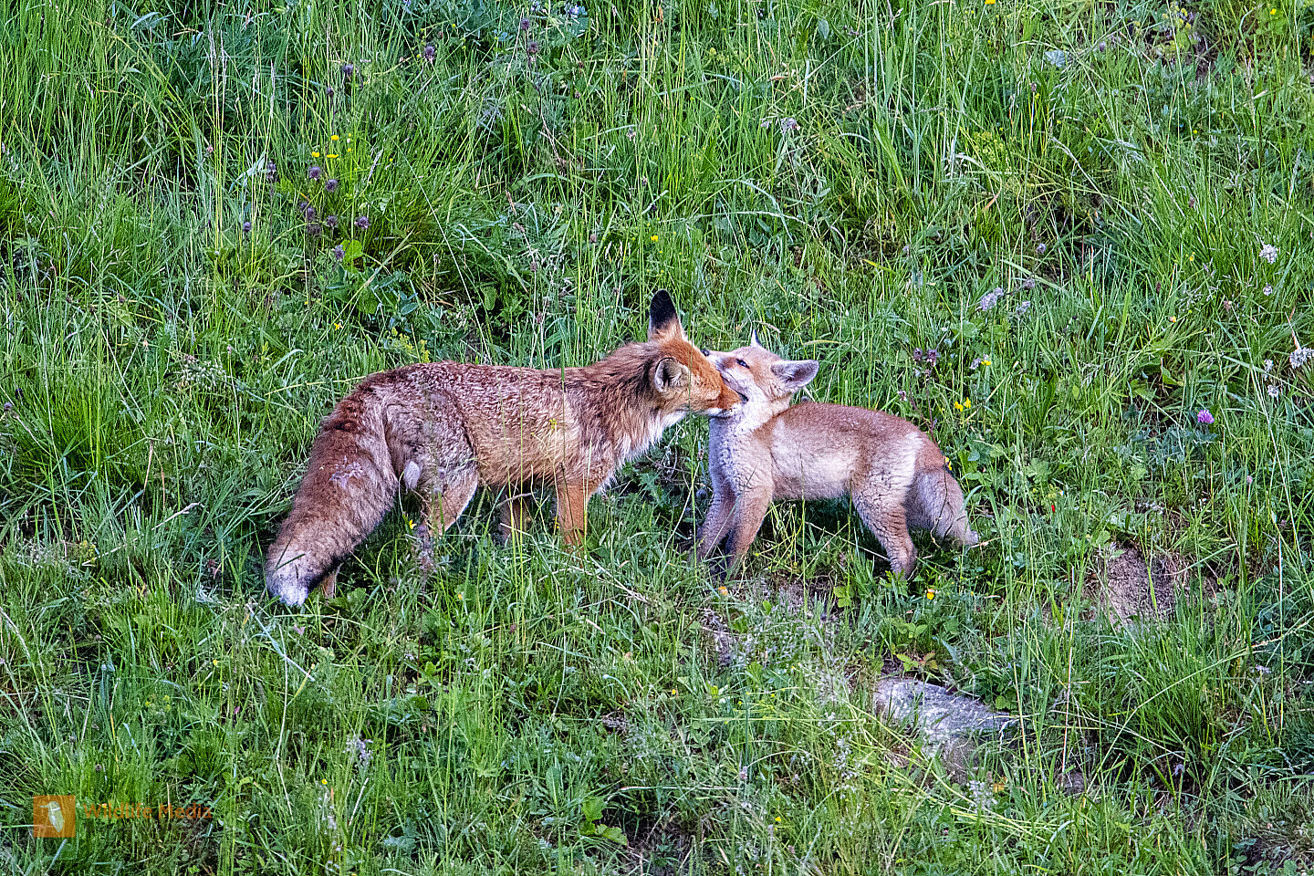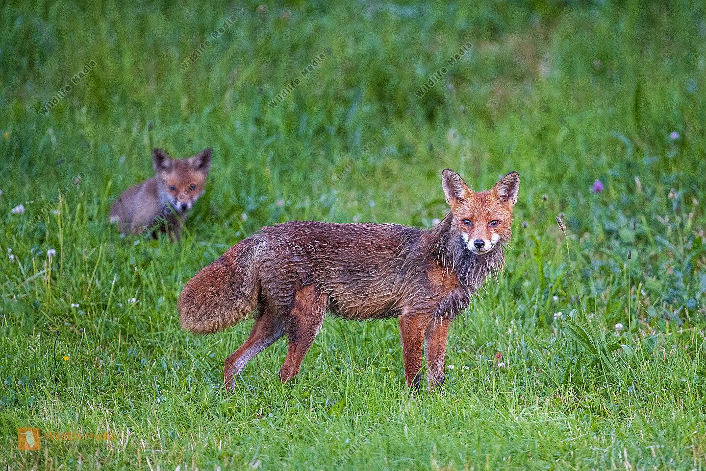 Altfuchs Vulpes vulpes mit Jungfuchs am Morgen