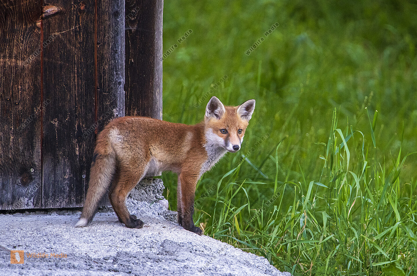 Jungfuchs Vulpes vulpes an einer Feldscheune