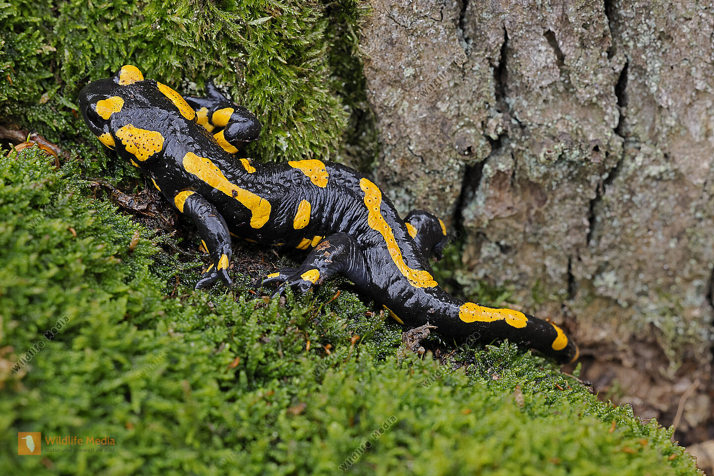 Feuersalamander Salamandra salamandra auf einem Baumstamm