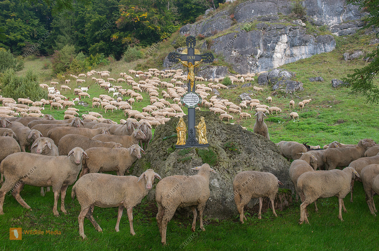 Schafherde Ovis aries an der Altmühl im Altmühltal