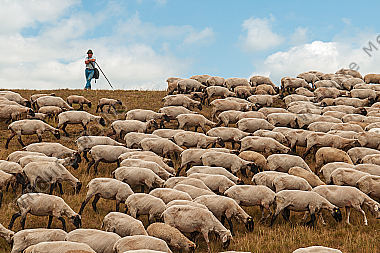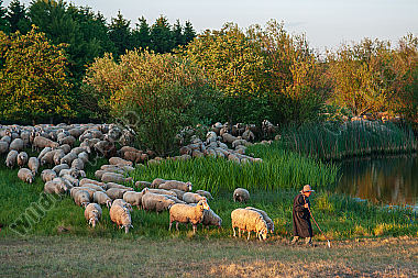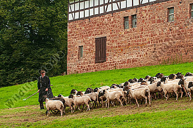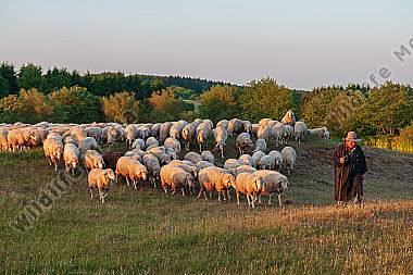 Schäfer mit seiner Schafherde Ovis aries am Waldrand