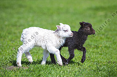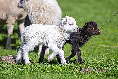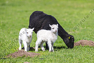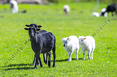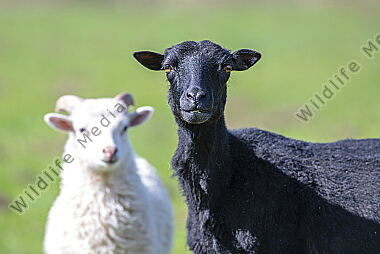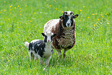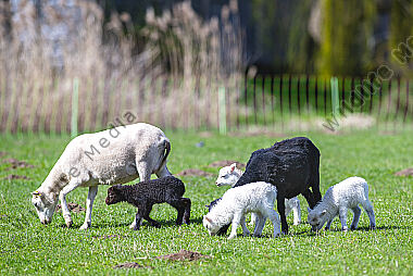 Skuddenmutterschaf mit Lämmern Ovis aries auf der Weide