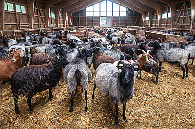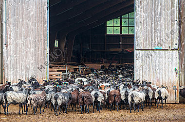 Heidschnuckenherde im Schafstall Tützberghof/Lüneburger Heide