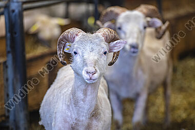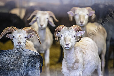Weiße gehörnte Heidschnucken Böcke Ovis aries im Stall