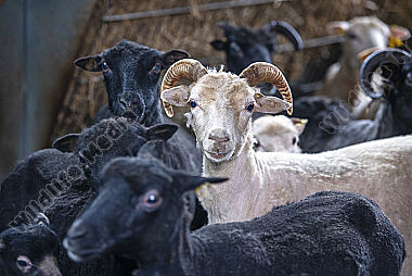 Graue gehörnte Heidschnucke und Moorschnucke Ovis aries im Stall