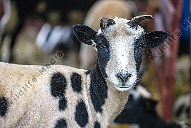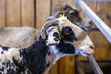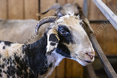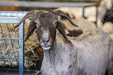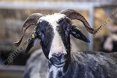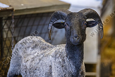 Graue gehörnte Heidschnucke junger Bock Ovis aries im Stall