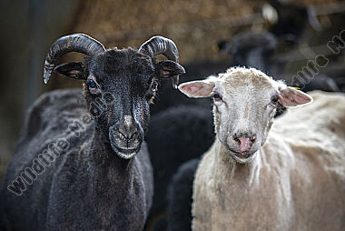 Jacobsschafbock links Weiße gehörnte Heidschnuckenbock rechts Ovis aries im Stall