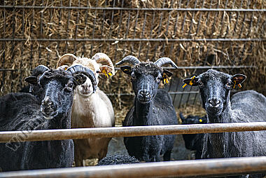 Graue gehörnte Heidschnucken Ovis aries im Stall