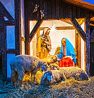 Merinoschafe Ovies aries vor der Weihnachtskrippe