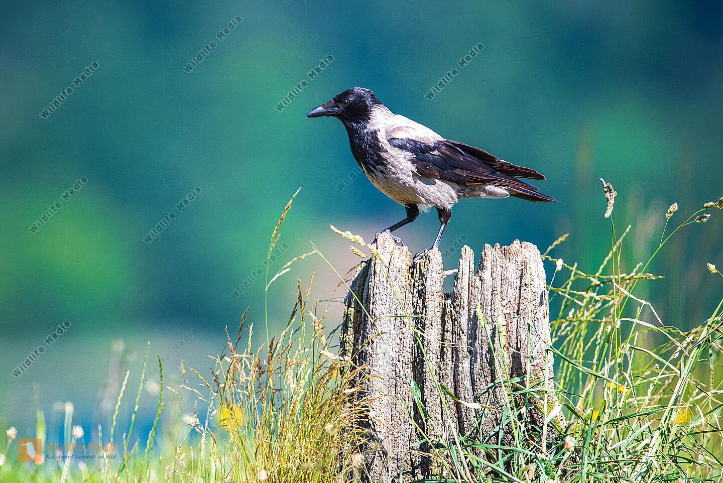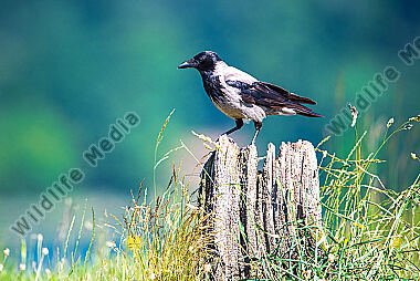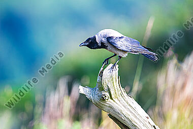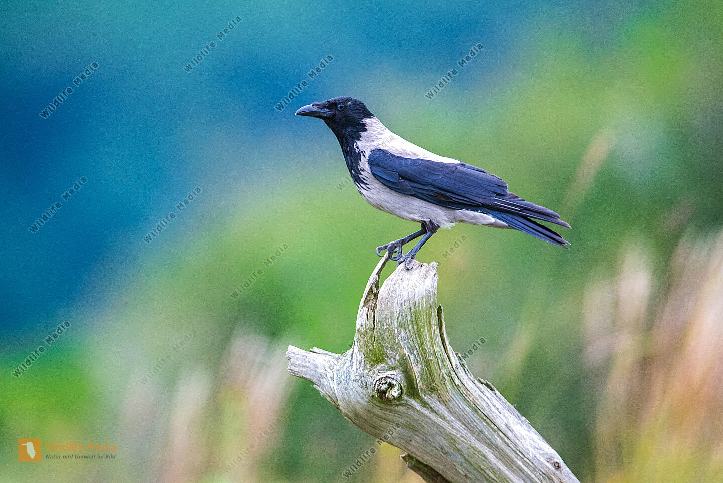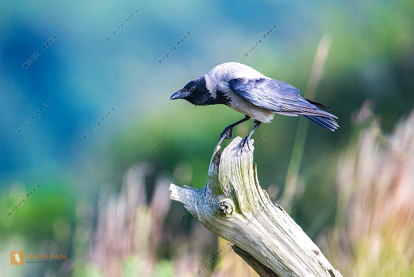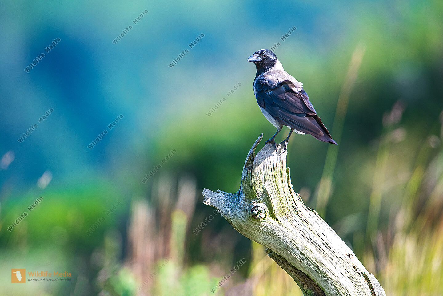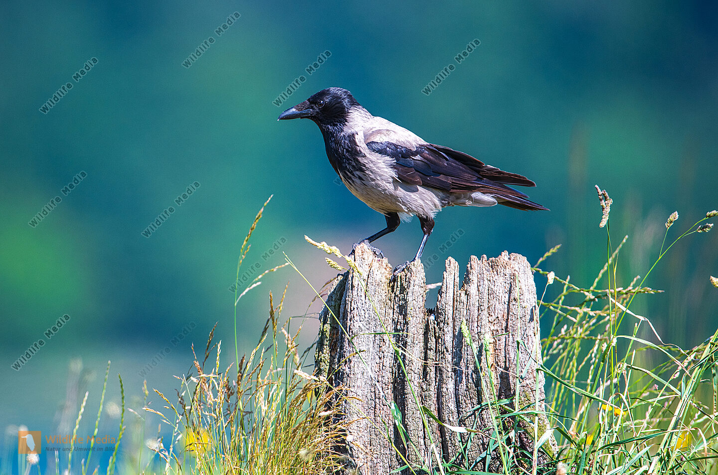 Nebelkrähe Corvus cornix auf einem Baustumpf