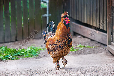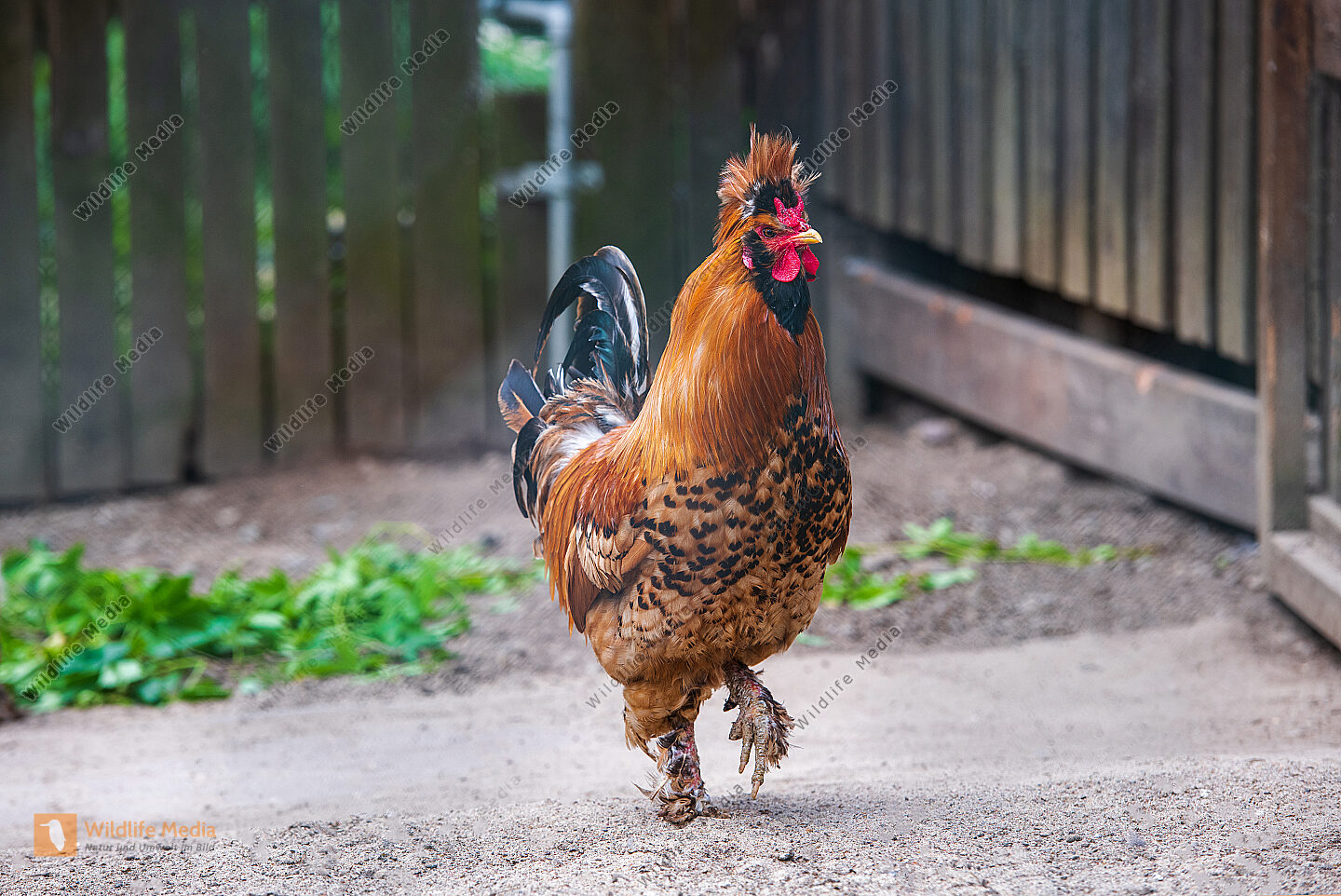 Haushahn Gallus gallus domesicus auf dem Gartenzaun