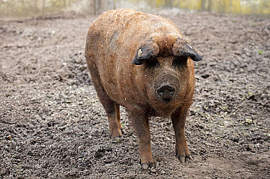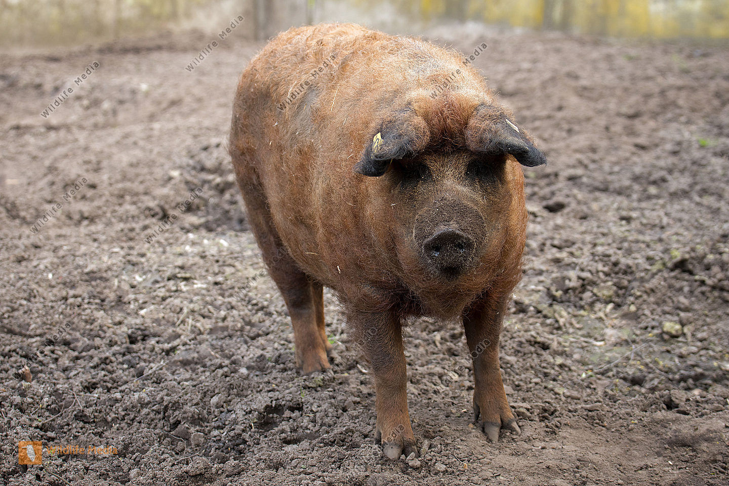 Junges Wildschwein Sus scrofa Frischling mit Klettengewächs