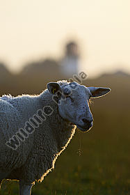 Texelschaf Ovis aries vor Leuchtturm am Abend Portrait