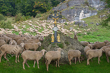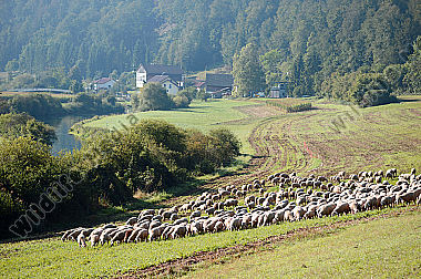 Schafherde Ovis aries an der Altmühl im Altmühtal