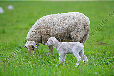 Skuddenmutterschaf mit Lämmern Ovis aries auf der Weide
