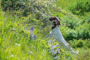 Schäfer mit Hütehunden und Schafherde am Waldrand