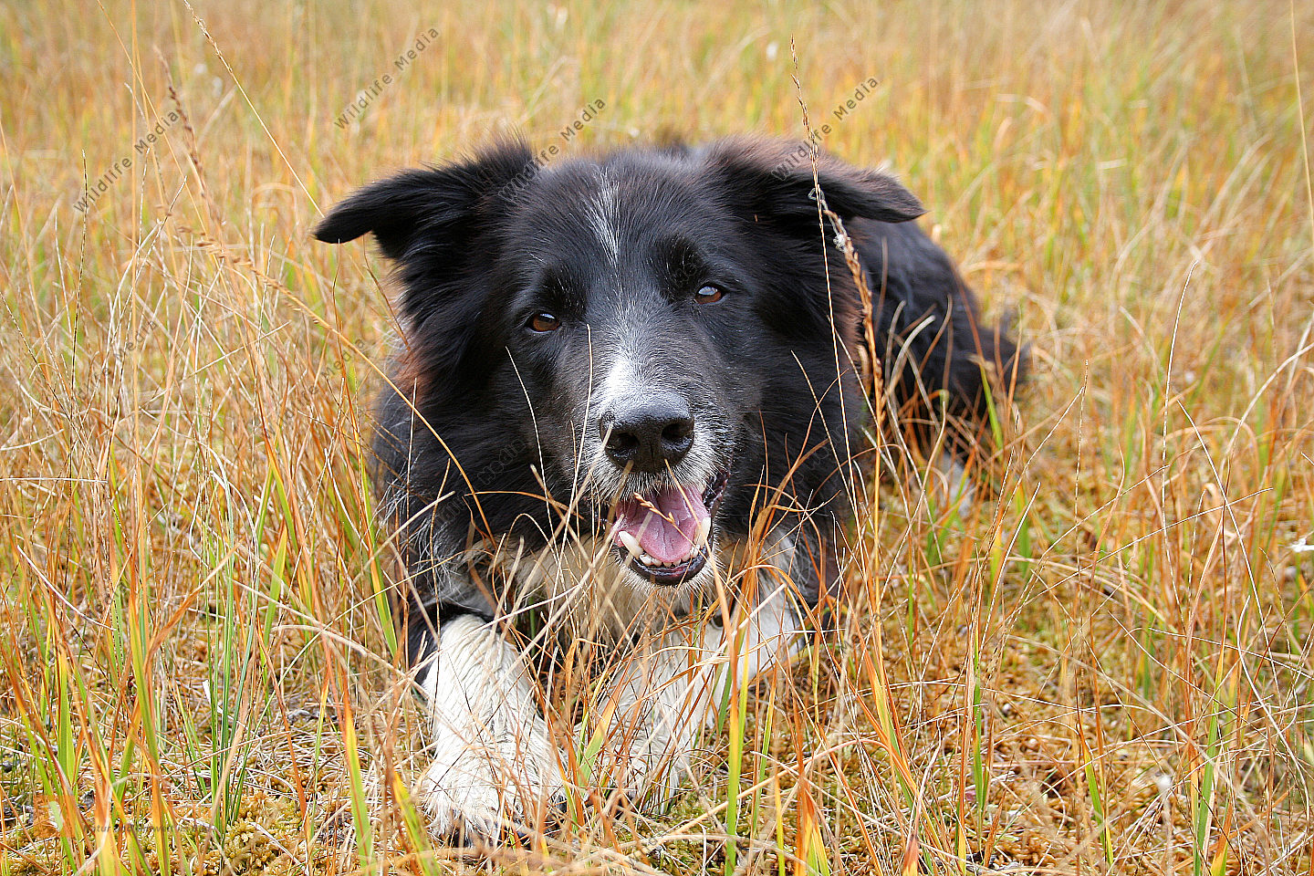 Junger Altdeutscher Hütehund Canis lupus familiaris in der Heide