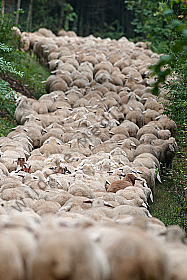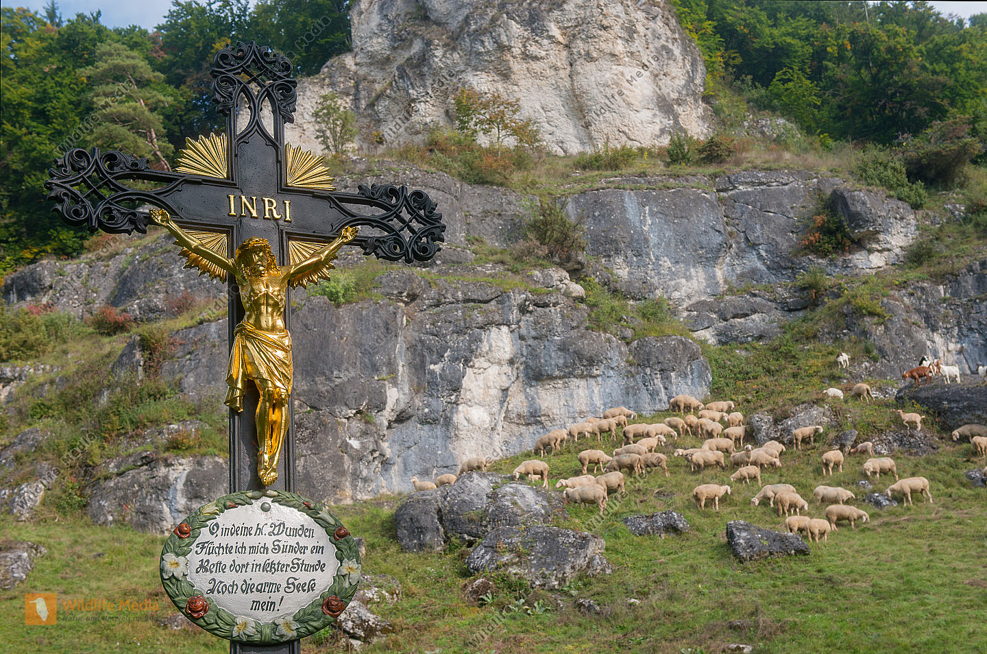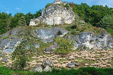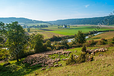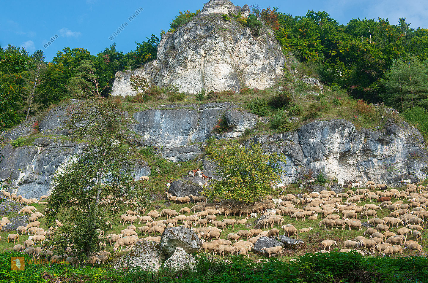 Schafherde Ovis aries an der Altmühl im Altmühtal