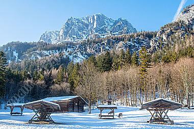 Schäfer mit Hütehunden und Schafherde am Waldrand