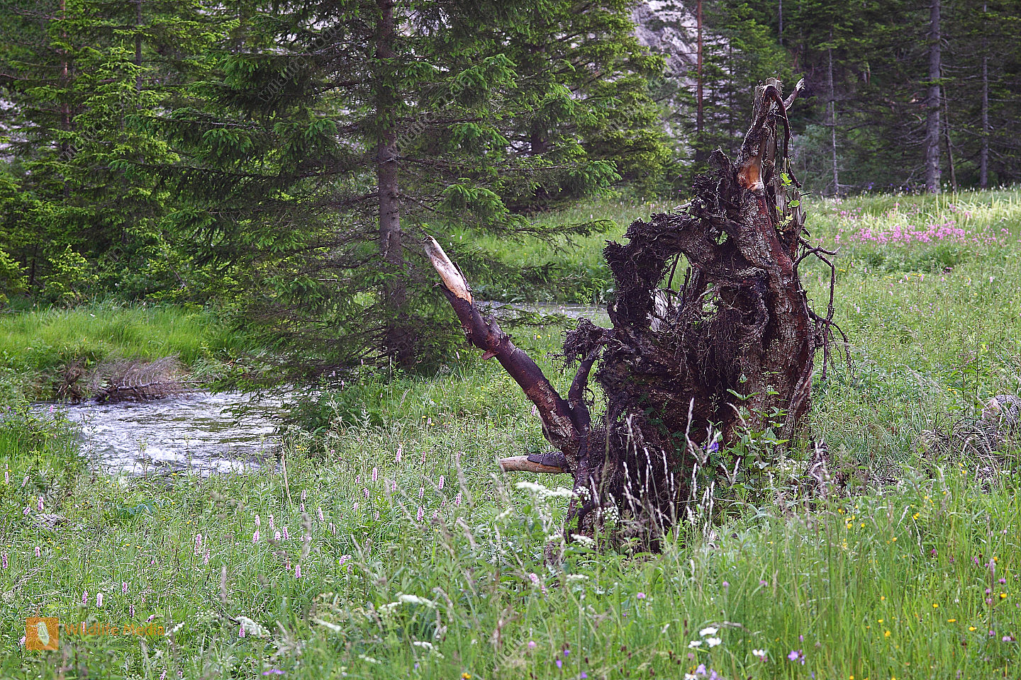 Schäfer mit Hütehunden und Schafherde am Waldrand