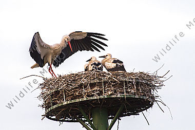 Drei Jungstörche im Nest warten auf Futter
