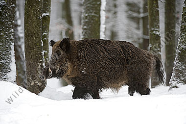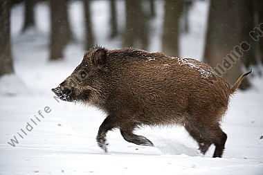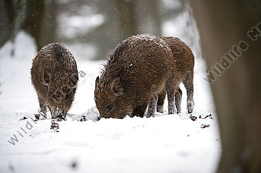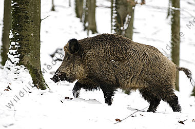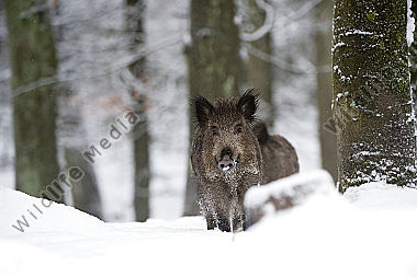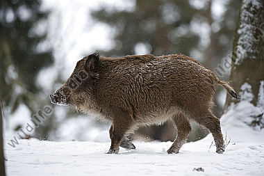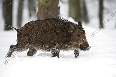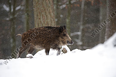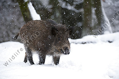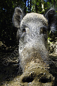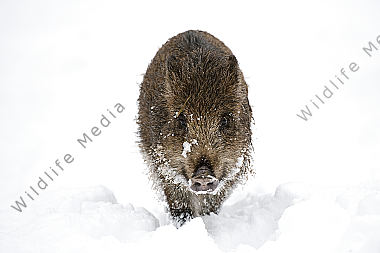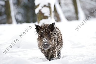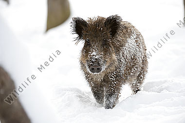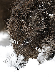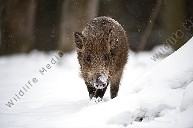 Junges Wildschwein Sus scrofa Frischling mit Klettengewächs